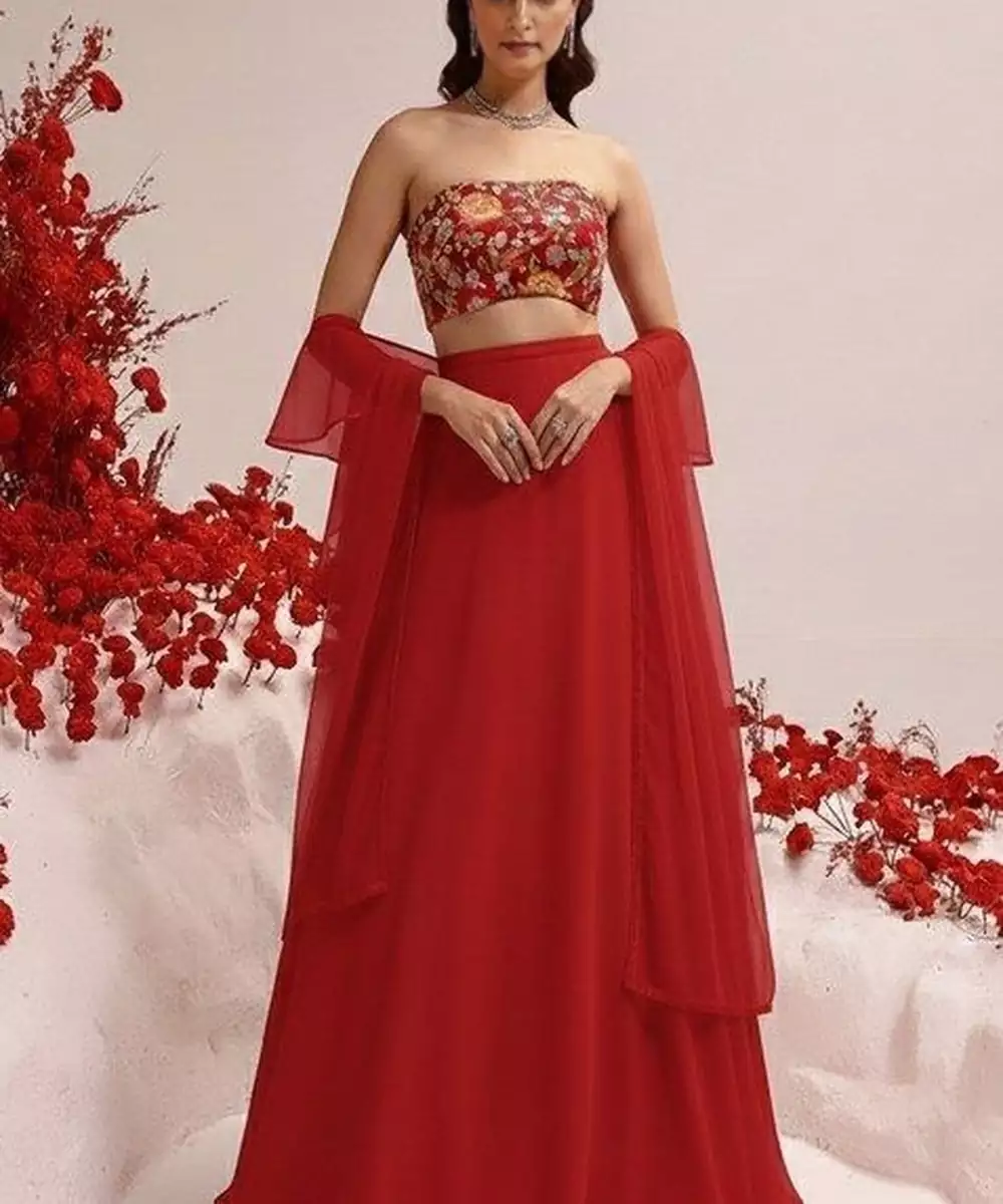 Red Viscose Crepe Solid Lehenga Set With Embroidery Blouse