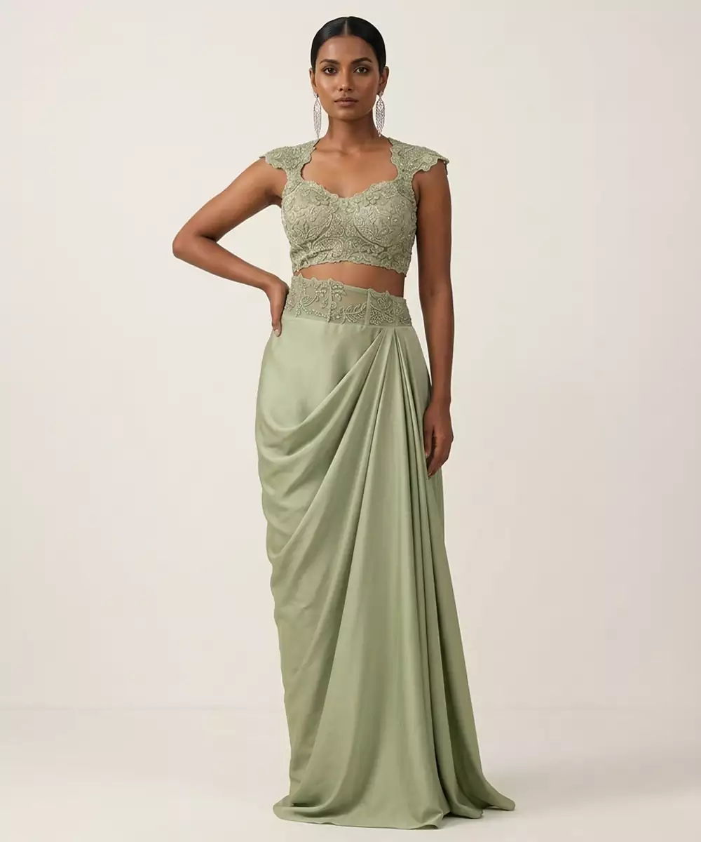 This Sage Green Satin Co Ord Set Features Fine Embroidery That Enhances Its Soft And Elegant Appeal. The Smooth Fabric Offers A Luxurious Feel And Comfortable Fit. Ideal For Festive Occasions, It Pairs Beautifully With Minimal Accessories For A Refined And Sophisticated Look.