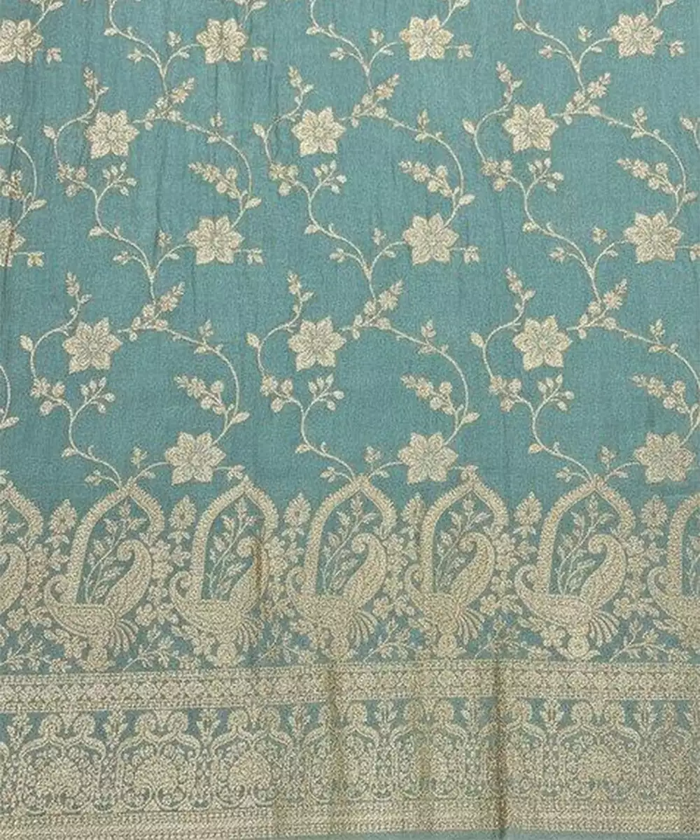 This Turquoise Blue Tissue Lehenga Set Features Elegant Embroidery That Enhances Its Luminous Texture. The Fabric’s Soft Sheen Adds Sophistication While The Flared Silhouette Creates A Graceful Look. Paired With A Coordinated Blouse And Dupatta, It Is Ideal For Festive Occasions And Special Celebrations.