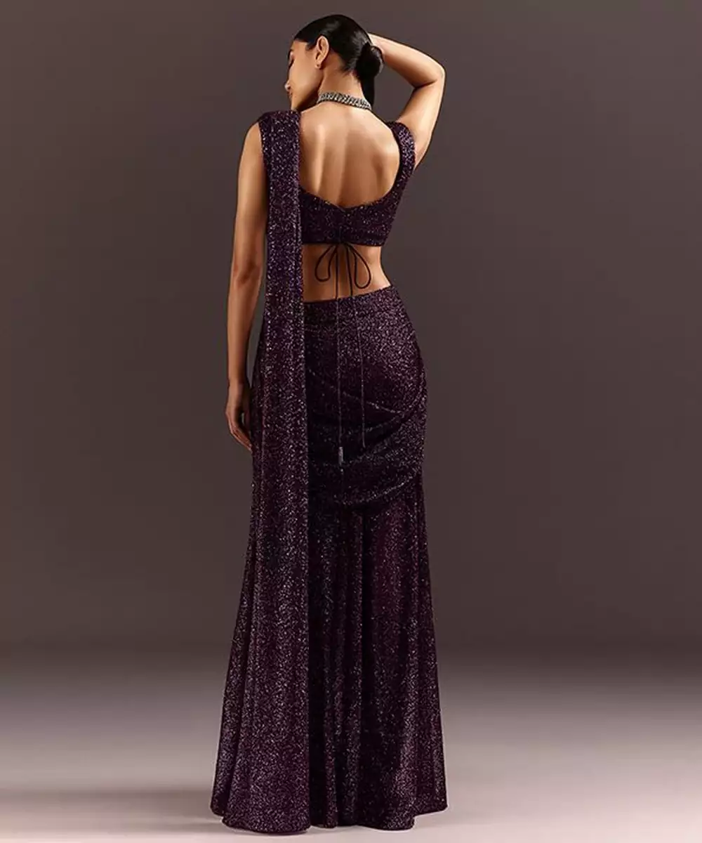 This Wine Embroidered Georgette Pre Draped Saree Set Showcases Graceful Elegance With Intricate Detailing. The Flowing Georgette Fabric Offers Comfort And Movement While Embroidery Adds Festive Charm. The Pre Stitched Design Ensures Easy Wear. Perfect For Weddings, Parties, And Special Celebrations.
