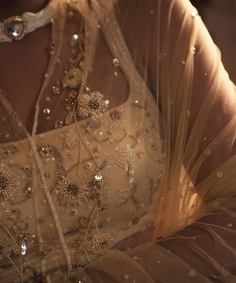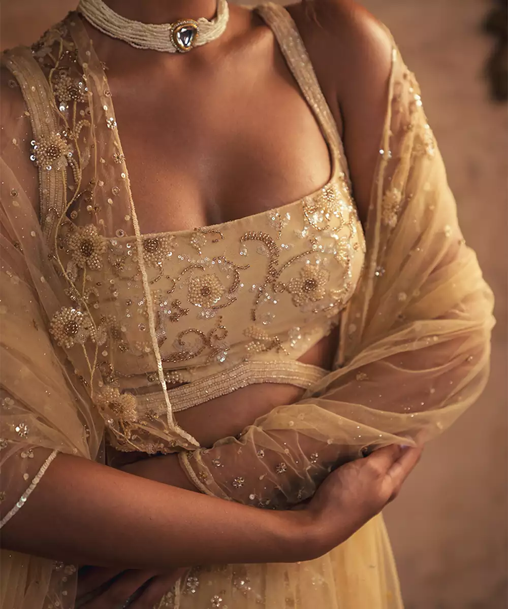 This Gold Embroidered Net Lehenga Set Exudes Graceful Elegance And Festive Charm. Crafted From Sheer Net Fabric, It Features Intricate Embroidery That Adds A Delicate, Refined Touch. Perfect For Weddings And Celebrations, It Drapes Beautifully And Enhances Traditional Looks With Timeless Sophistication.