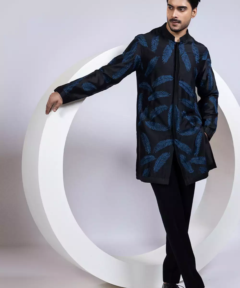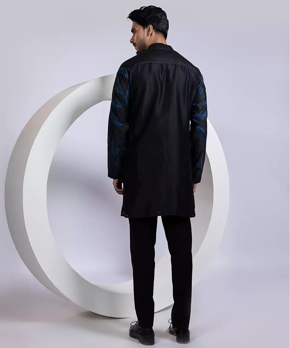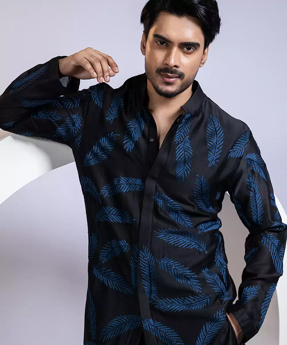 This Black Embroidered Chanderi Kurta Pajama Exudes Timeless Elegance And Refined Charm. Crafted From Lightweight, Breathable Chanderi Fabric, It Features Intricate Embroidery That Enhances Its Sophisticated Appeal. The Tailored Kurta Paired With A Classic Pajama Ensures Comfort And A Polished Silhouette, Making It Perfect For Weddings, Festive Occasions, Or Special Celebrations.