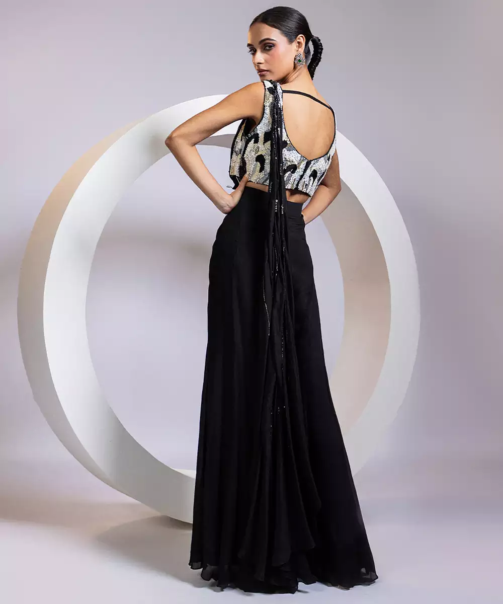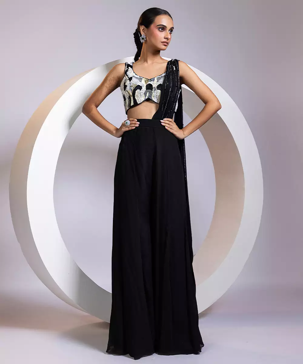 This Black Embroidered Chinon Co Ord Set Radiates Refined Elegance With Its Soft Sheen And Fluid, Graceful Drape. Intricate Embroidery Adds A Festive, Artistic Touch, Enhancing Its Rich, Timeless Appeal. Perfect For Celebrations, Evening Events, And Traditional Gatherings, It Blends Comfort With Sophisticated Style For A Striking Contemporary Ensemble.