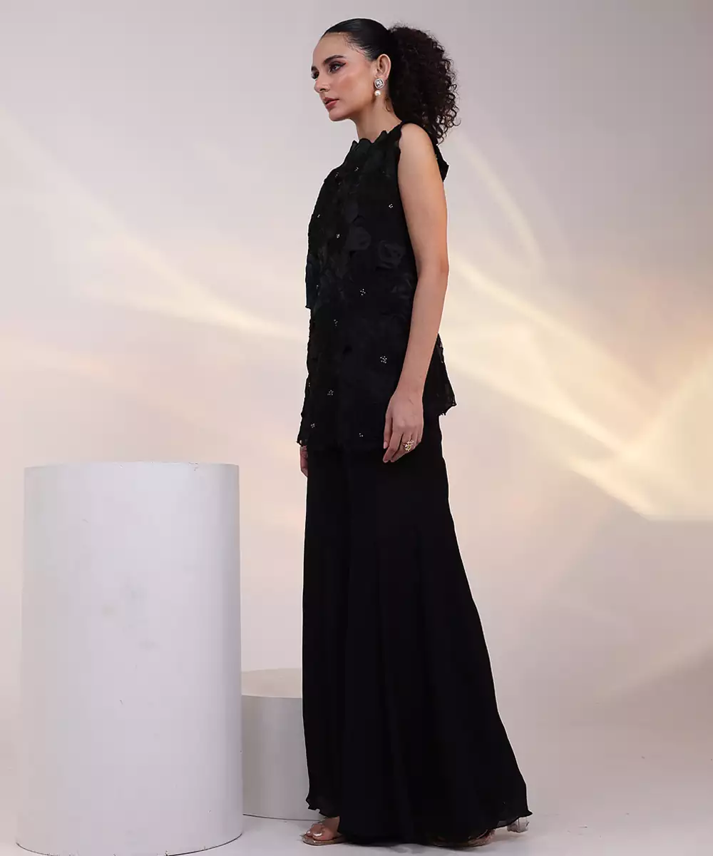 Make A Striking Statement With This Black Embroidered Crepe Co Ord Set, Crafted In Smooth Crepe Fabric For A Refined Drape. Delicate Embroidery Elevates The Coordinated Top And Bottom, Offering A Perfect Balance Of Elegance And Comfort For Festive Occasions, Evening Events, And Contemporary Celebrations.