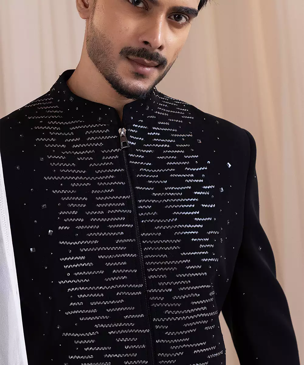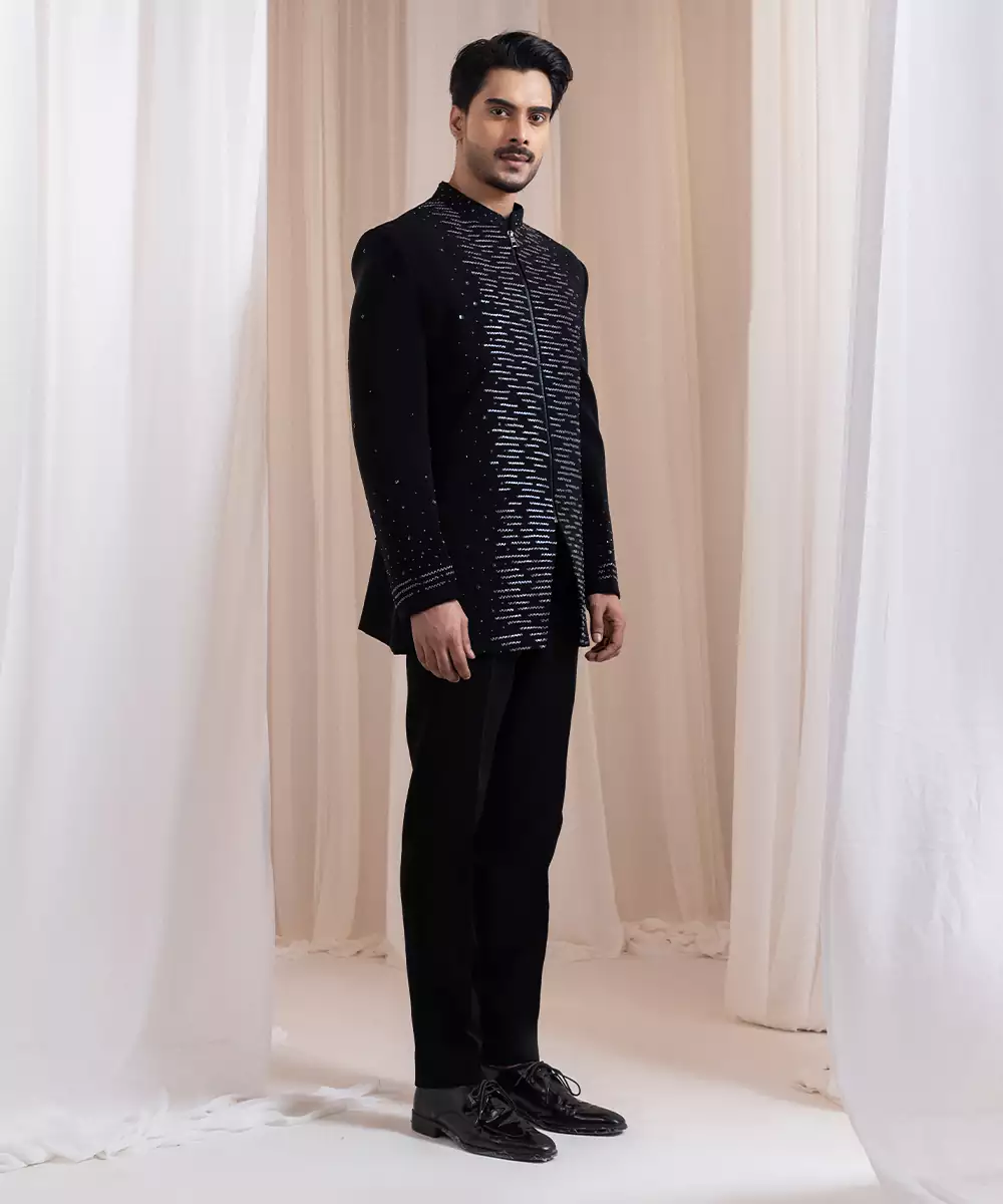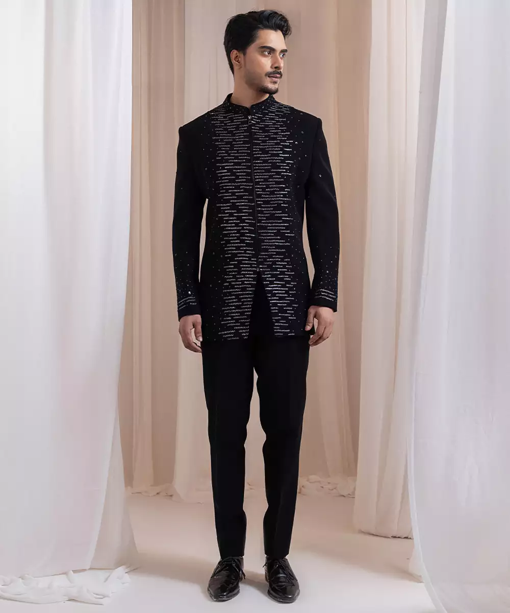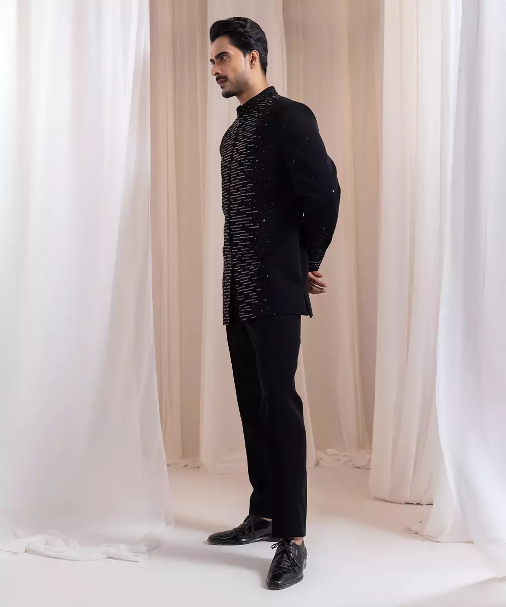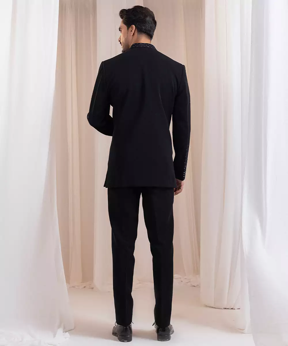 This Black Embroidered Lycra Bandhgala Set Blends Contemporary Style With Elegant Sophistication. Crafted From Stretchable Lycra, It Offers A Comfortable, Flattering Fit, While Intricate Embroidery Adds Refined Charm. Perfect For Parties, Festive Occasions, Or Evening Events, It Delivers A Chic, Modern Silhouette With A Seamless Fusion Of Traditional And Western Appeal.