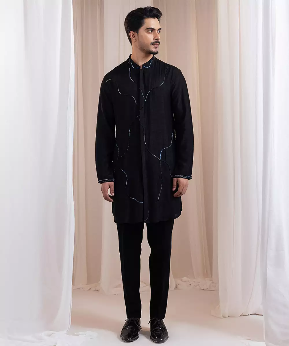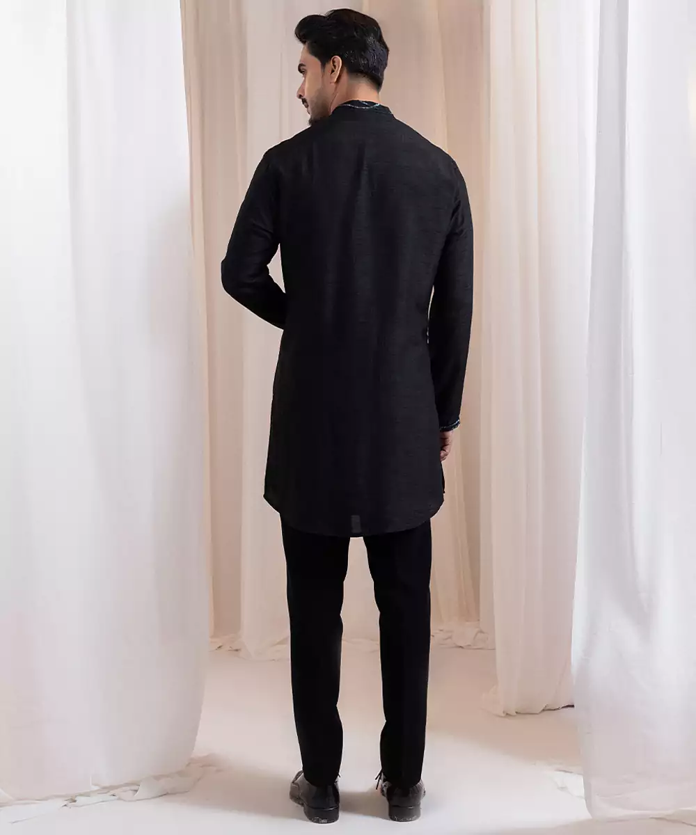 This Black Embroidered Silk Kurta Pajama Blends Timeless Elegance With Festive Charm. Crafted From Luxurious Silk, It Features Intricate Embroidery That Enhances Its Sophisticated Appeal. The Tailored Kurta Paired With A Classic Pajama Ensures A Graceful, Polished Silhouette, Making It Perfect For Weddings, Celebrations, Or Special Cultural Occasions.