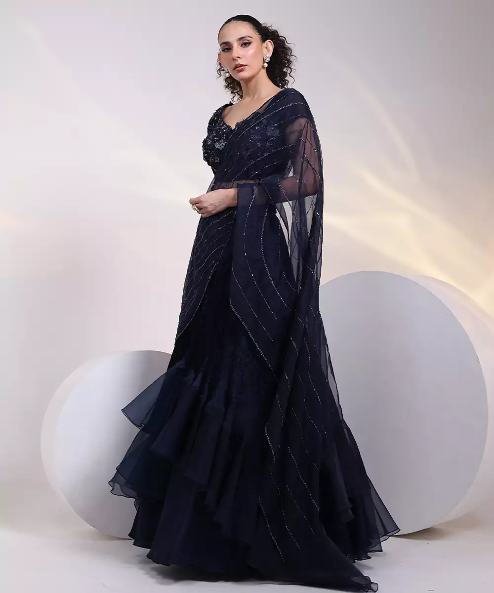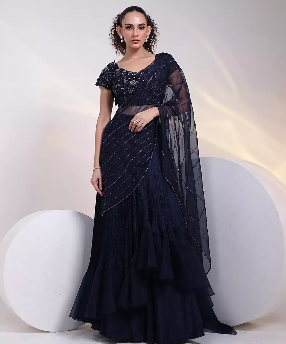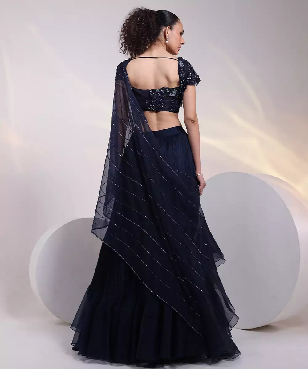 Blue Embroidered Chiffon Lehenga Set Crafted With Delicate Detailing And A Graceful Flow. Featuring A Stylish Blouse, Fluid Skirt, And Sheer Dupatta, This Elegant Ensemble Is Perfect For Festive Occasions, Receptions, And Evening Celebrations With A Modern Yet Timeless Appeal.