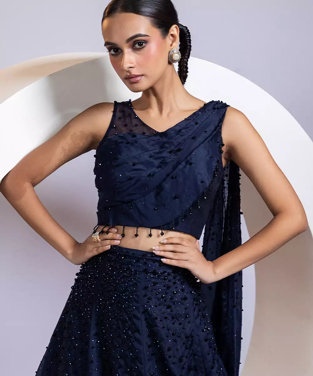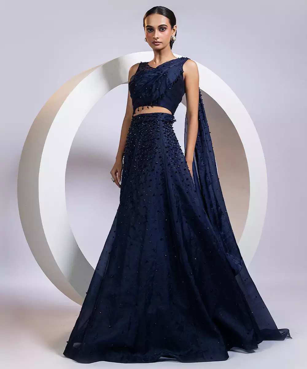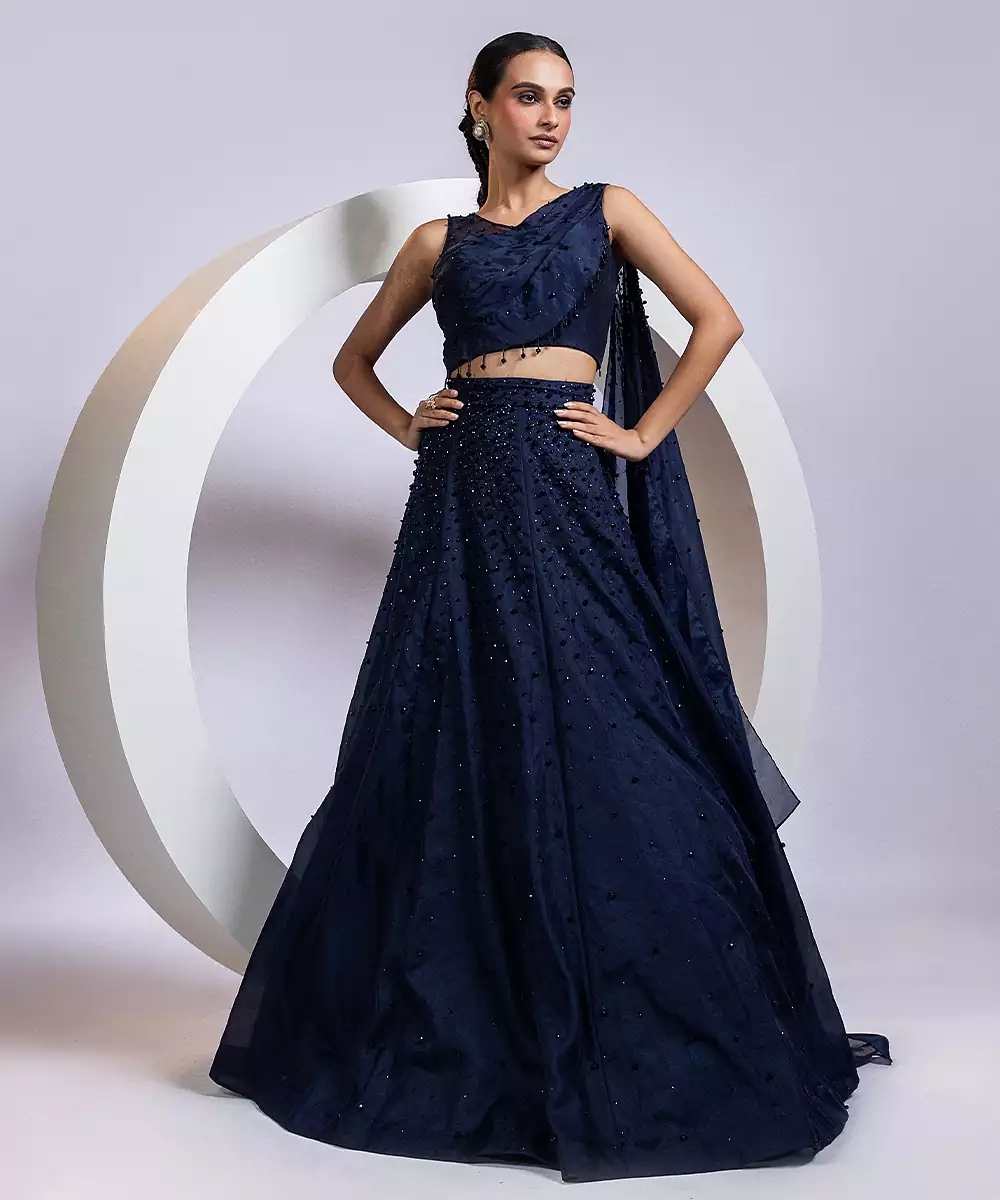 This Blue Embroidered Organza Lehenga Set Exudes Ethereal Elegance With Its Lightweight, Sheer Fabric And Beautifully Flared Silhouette. Intricate Embroidery Adds A Delicate, Festive Touch, Enhancing Its Graceful Charm. Perfect For Weddings, Celebrations, And Special Occasions, It Blends Comfort With Sophistication, Creating A Stylish And Timeless Ethnic Ensemble.
