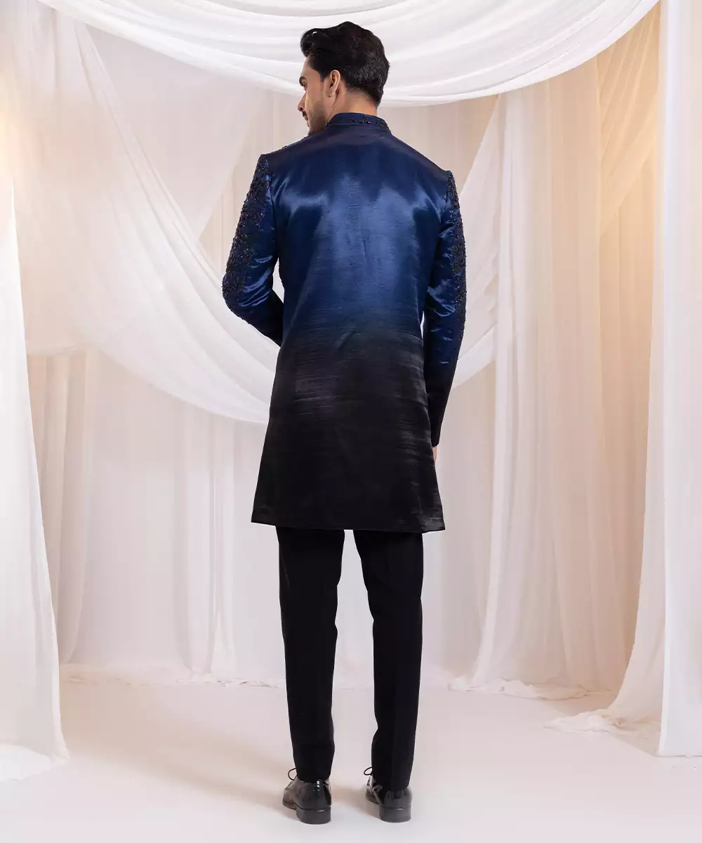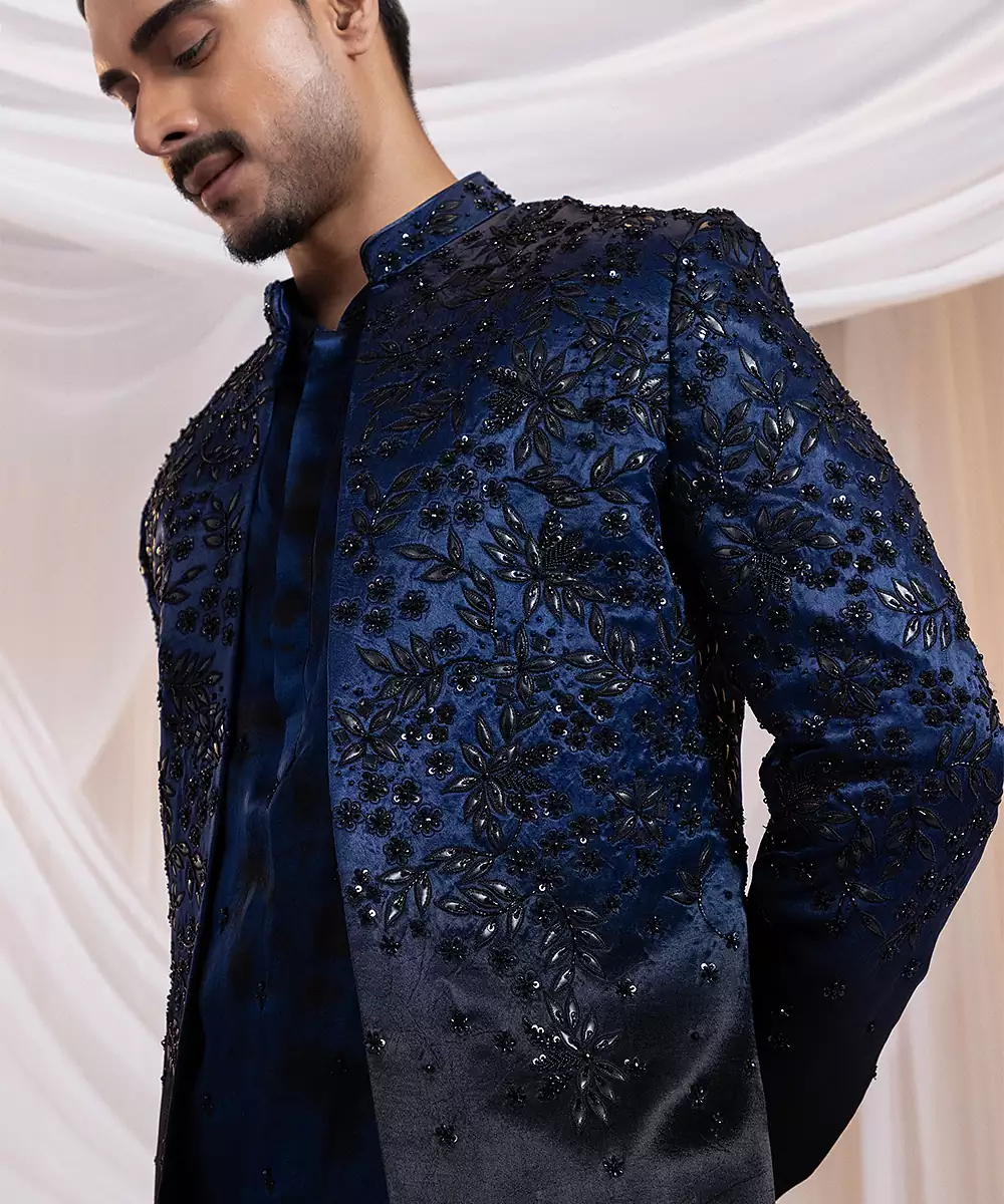 This Blue Embroidered Satin Bandhgala Exudes Regal Elegance And Contemporary Charm. Crafted From Smooth, Luxurious Satin, It Features Intricate Embroidery That Enhances Its Sophisticated Appeal. Perfect For Weddings, Festive Occasions, Or Formal Celebrations, It Offers A Tailored Silhouette And Timeless Style, Making It A Standout Addition To Any Ethnic Ensemble.