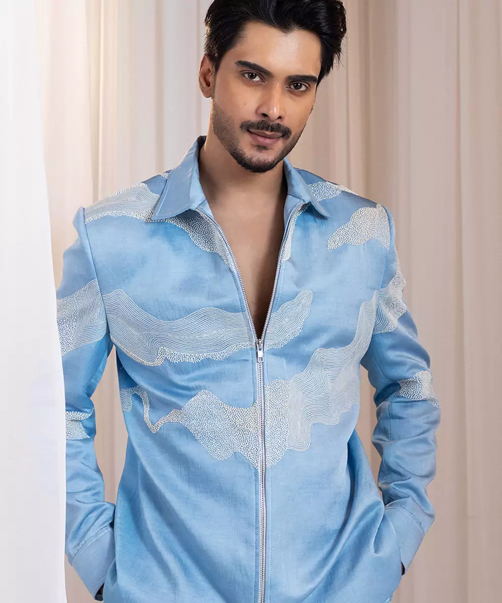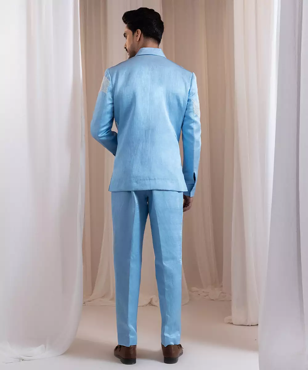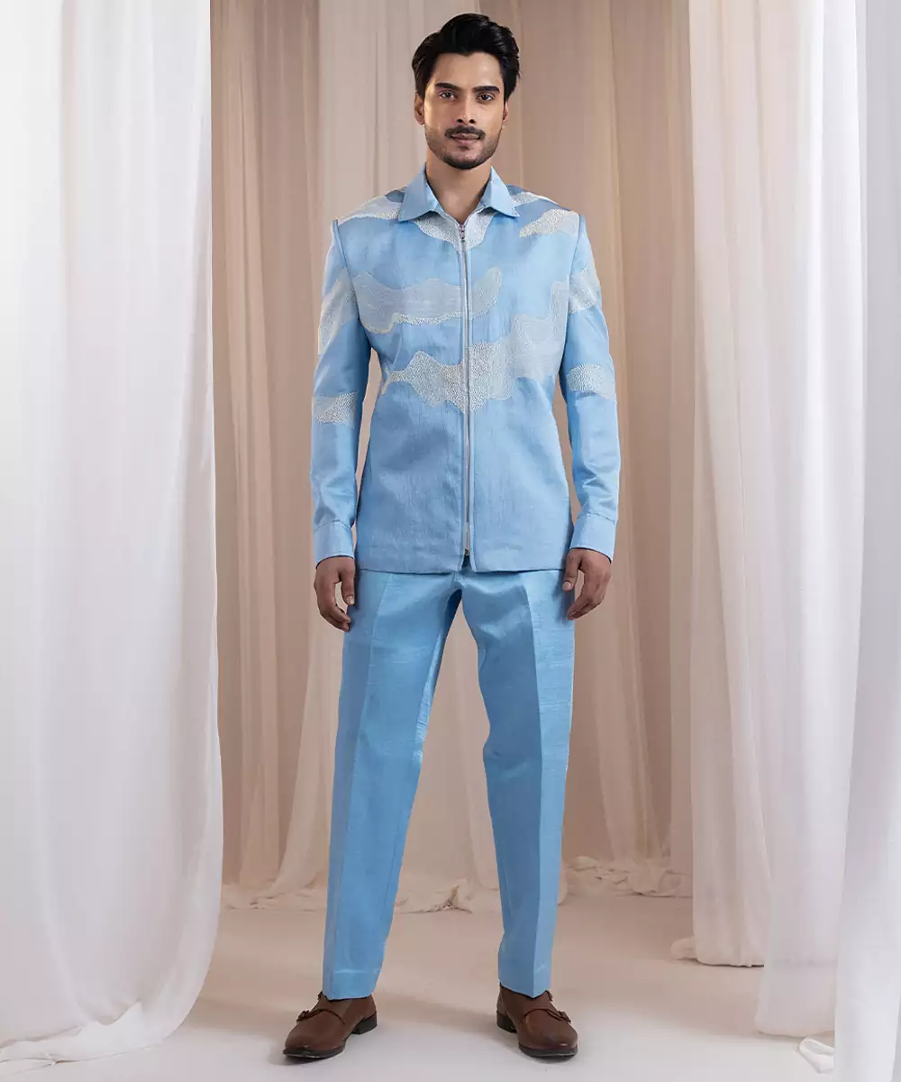 This Blue Embroidered Satin Co Ord Set Blends Contemporary Style With Elegant Sophistication. Crafted From Smooth, Luxurious Satin, It Features Intricate Embroidery That Adds Refined Charm. The Tailored Jacket Paired With Coordinated Pieces Creates A Chic, Polished Silhouette, Making It Perfect For Festive Occasions, Parties, Or Formal Events With Modern Appeal.