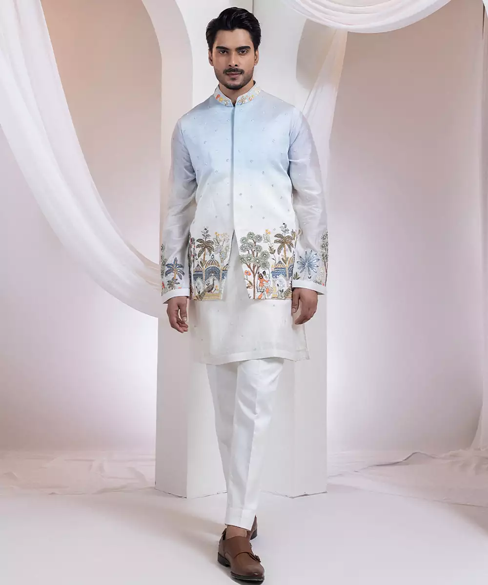 The Nehru With Omre Effect Features Delicate Scattered French Knots And Beads Emboirdery , While The Lower Panel Is Intricately Adorned With Vibrant Madhubani Style Embroidery. The Artwork Depicts Scenes Of Nature, Traditional Domes, Peacocks, And Figures In A Celebratory Setting, Using Multicolored Threadwork And Subtle Bead Embellishments.