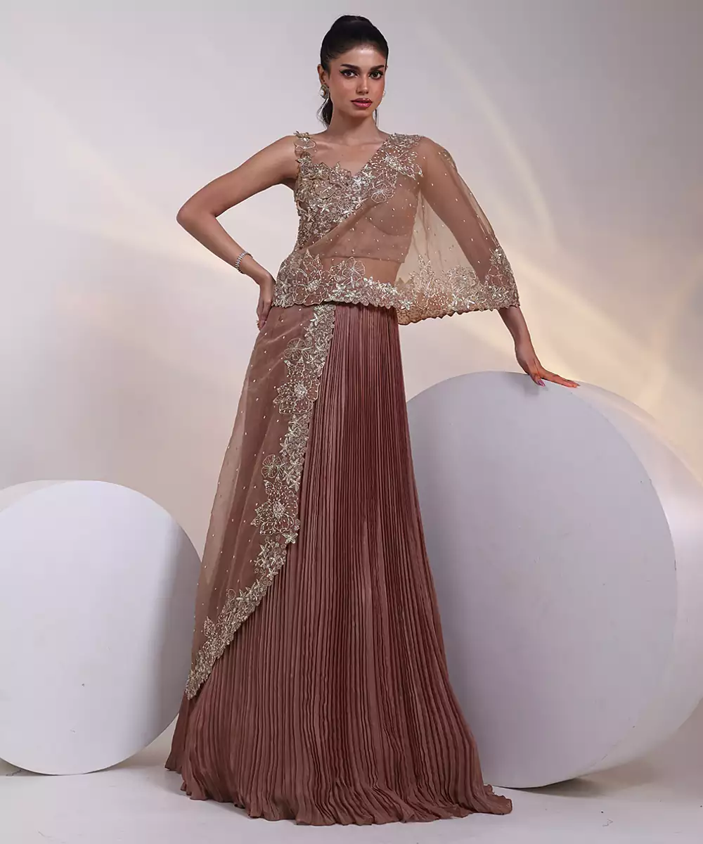 Brown Embroidered Chiffon Lehenga Set Designed With Delicate Embellishments And A Fluid Silhouette. Paired With A Graceful Blouse And Sheer Dupatta, This Elegant Ensemble Is Ideal For Festive Gatherings, Receptions, And Evening Celebrations With Understated Sophistication.