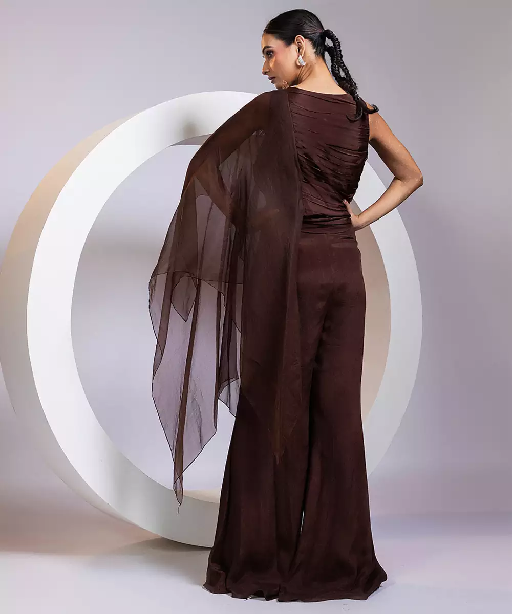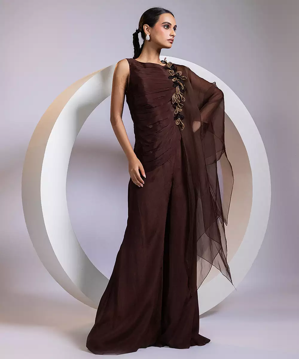 This Brown Embroidered Chinon Co Ord Set Radiates Refined Elegance With Its Soft Sheen And Fluid, Graceful Drape. Intricate Embroidery Adds A Festive, Artistic Touch, Enhancing Its Rich, Timeless Appeal. Perfect For Celebrations, Evening Events, And Traditional Gatherings, It Blends Comfort With Sophisticated Style For A Striking Contemporary Ensemble.