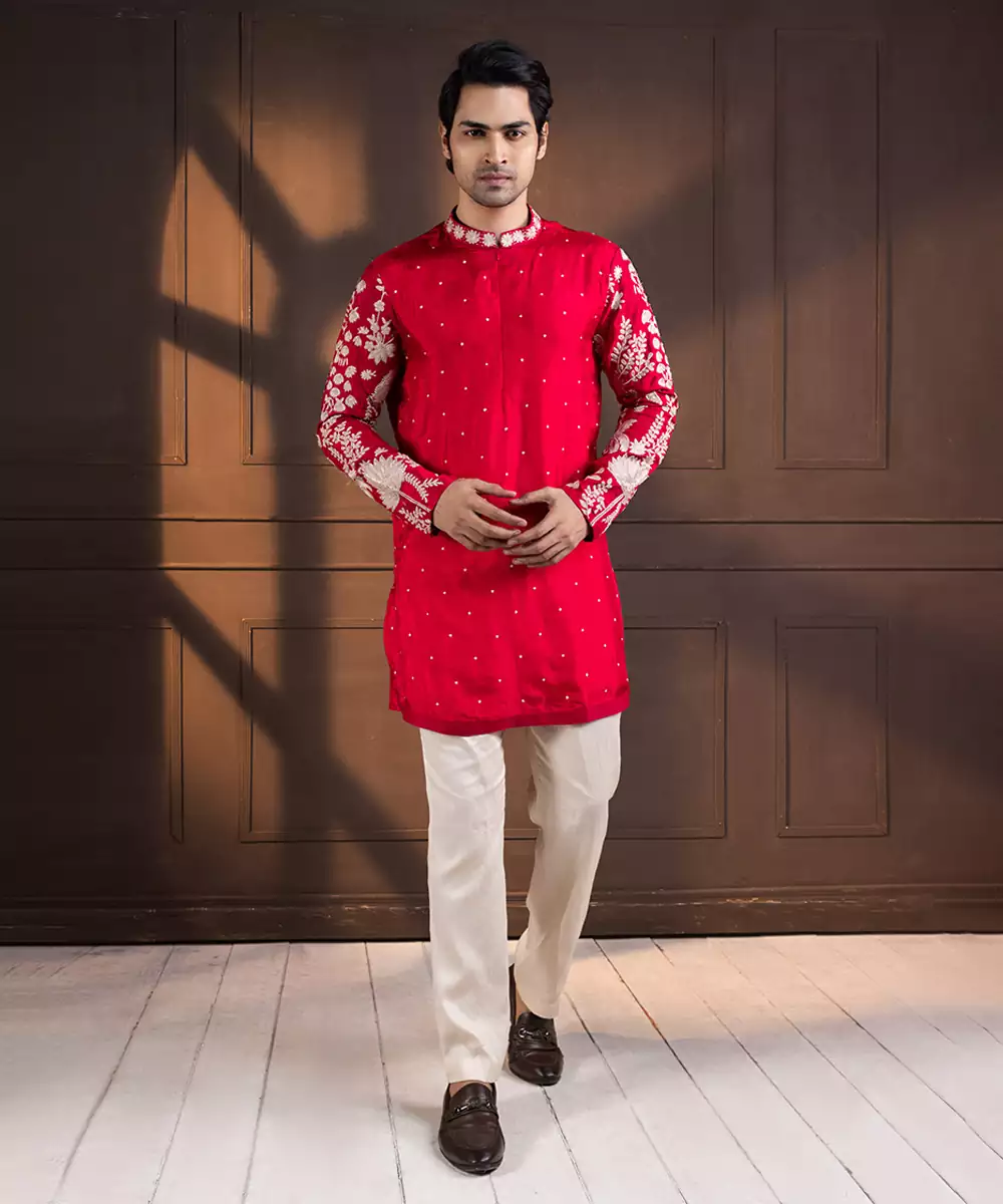 Make A Striking Statement With This Crimson Kurta, Adorned With Intricate White Embroidery Depicting Palm Trees, Botanical Motifs, And Floral Patterns. Crafted From Luxurious Fabric, The Kurta Combines Traditional Elegance With Contemporary Design. Its Comfortable Fit And Elaborate Detailing Make It A Perfect Choice For Weddings, Festive Occasions, And Cultural Celebrations. Pair It With Churidars Or Trousers For A Regal And Timeless Look.