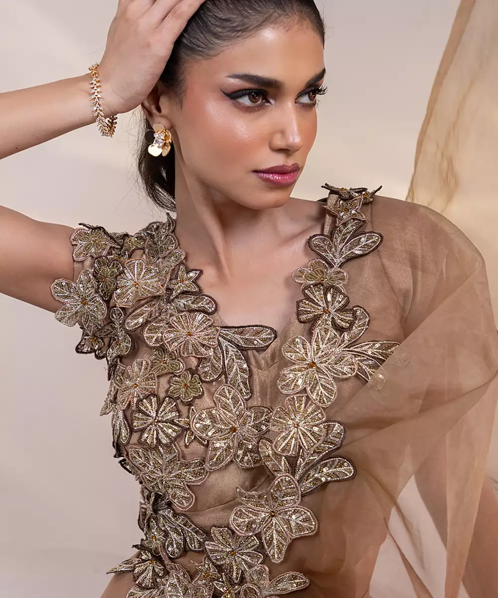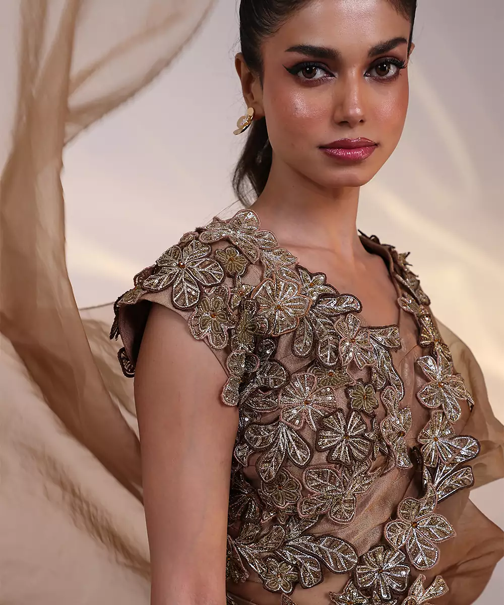 Gold Embroidered Tissue Lehenga Set Featuring Luxurious Fabric With Intricate Detailing, Paired With A Refined Blouse And Dupatta. A Radiant Choice For Weddings, Festive Occasions, And Grand Celebrations With Timeless Elegance.