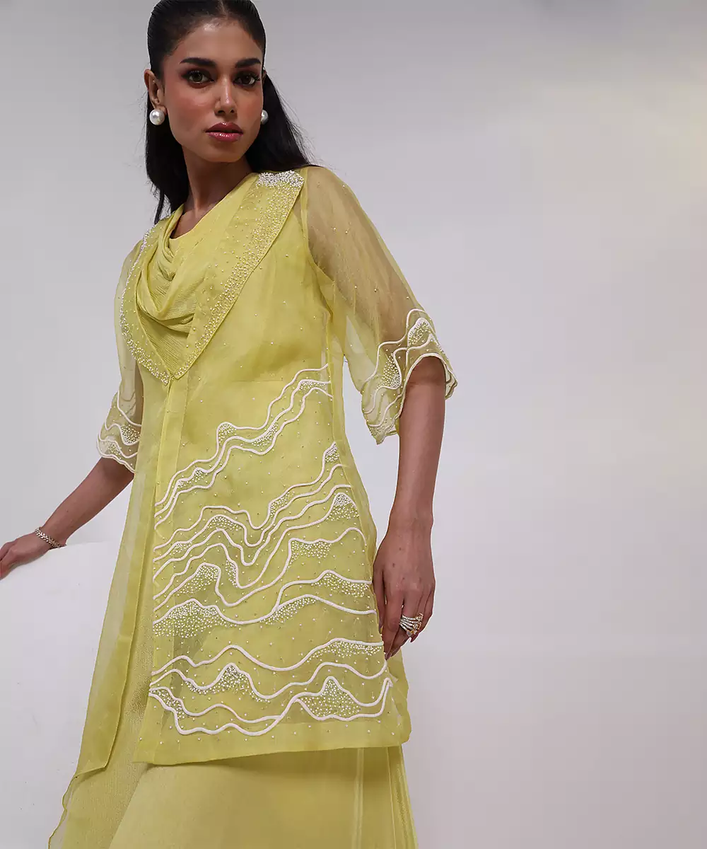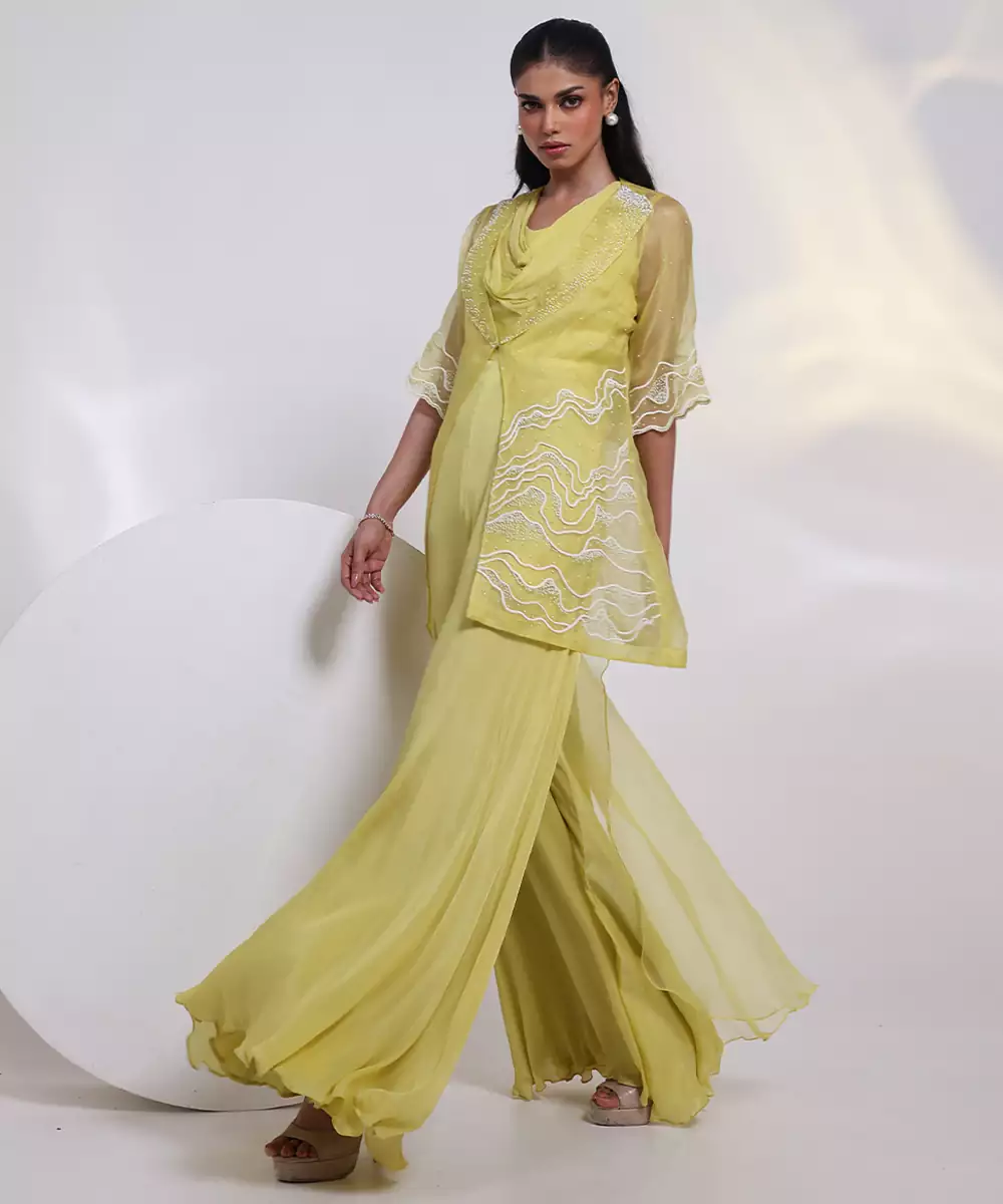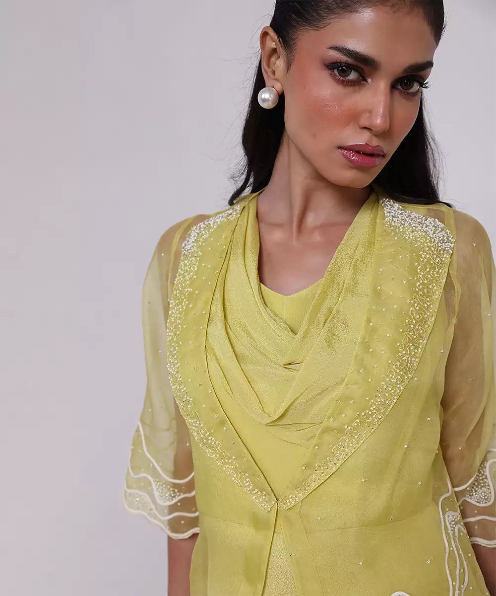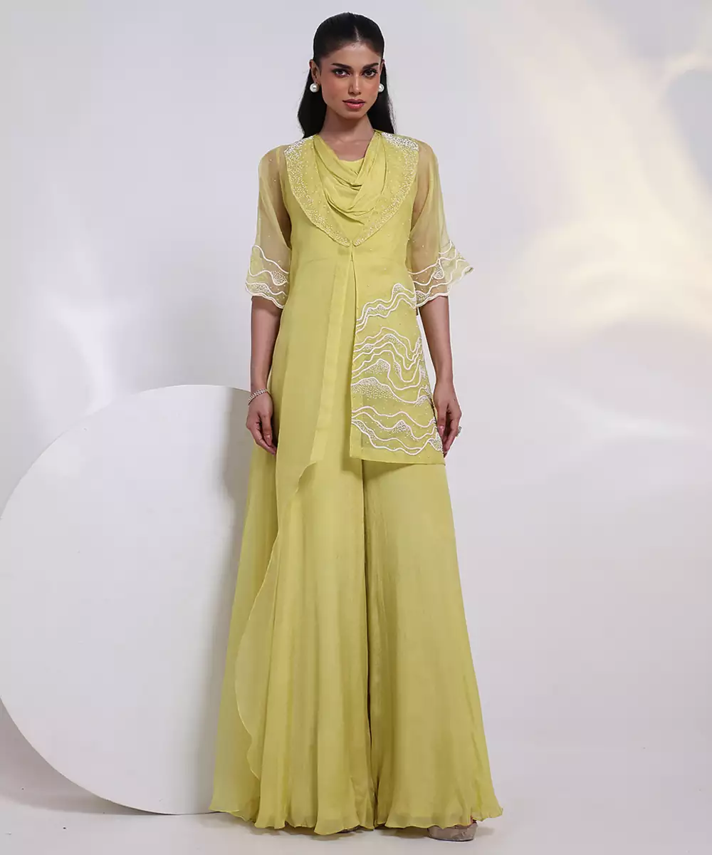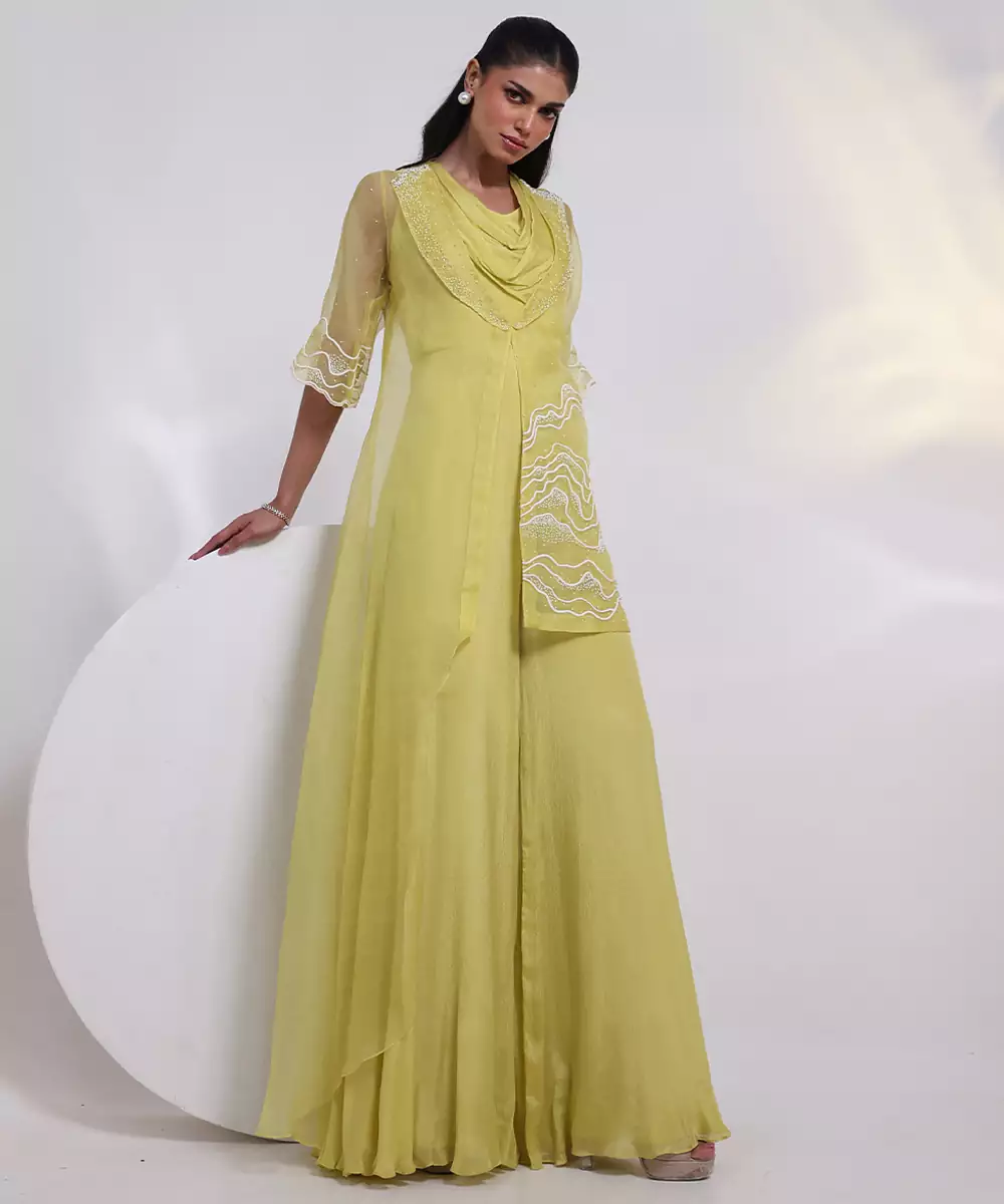 Elevate Your Festive Wardrobe With This Green Embroidered Chinon Jumpsuit, Designed In Flowy Chinon Fabric For Effortless Elegance. Featuring Intricate Embroidery, A Flattering Silhouette, And Graceful Drape, It Blends Contemporary Style With Ethnic Charm, Making It Perfect For Parties, Celebrations, And Special Occasions.