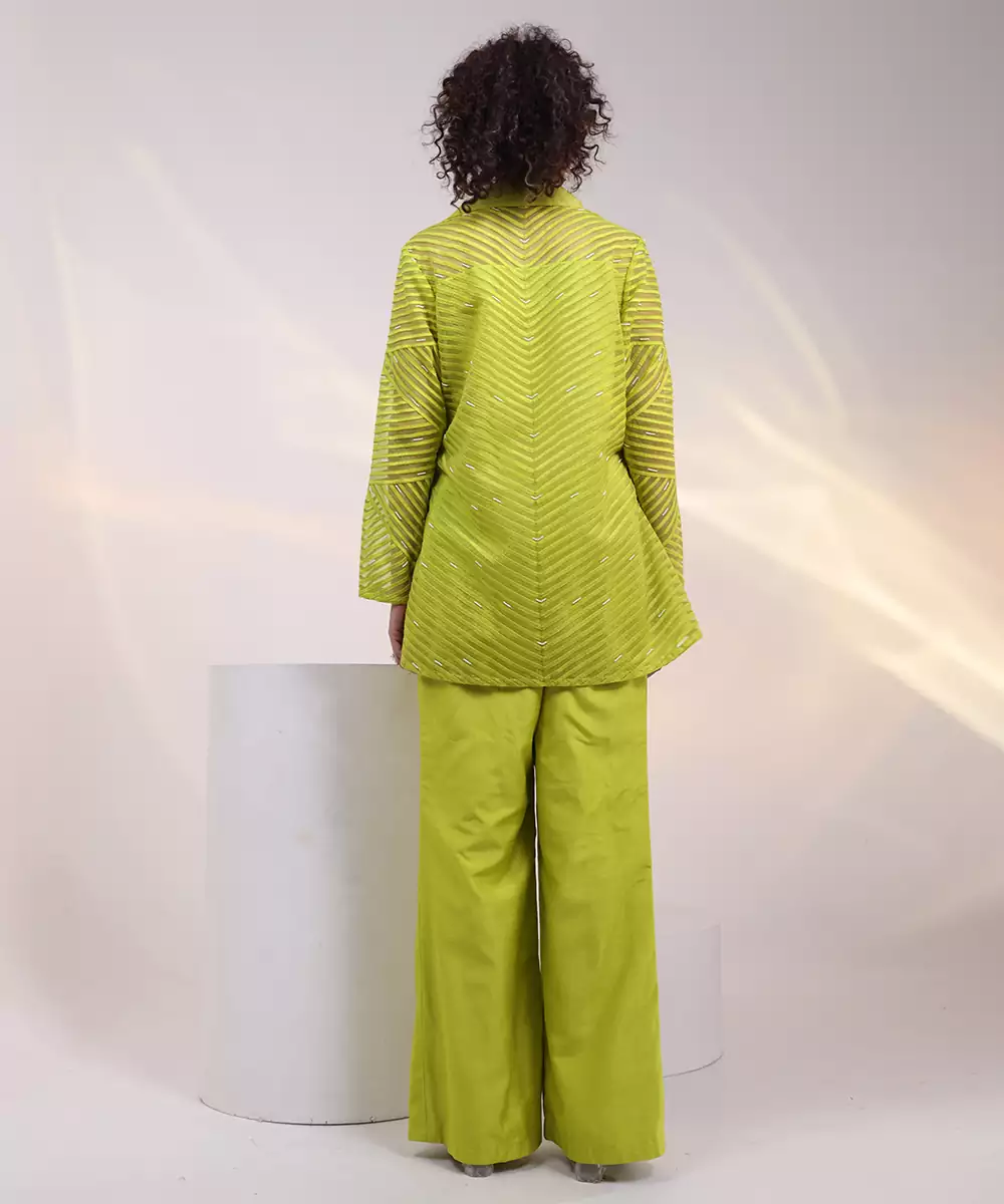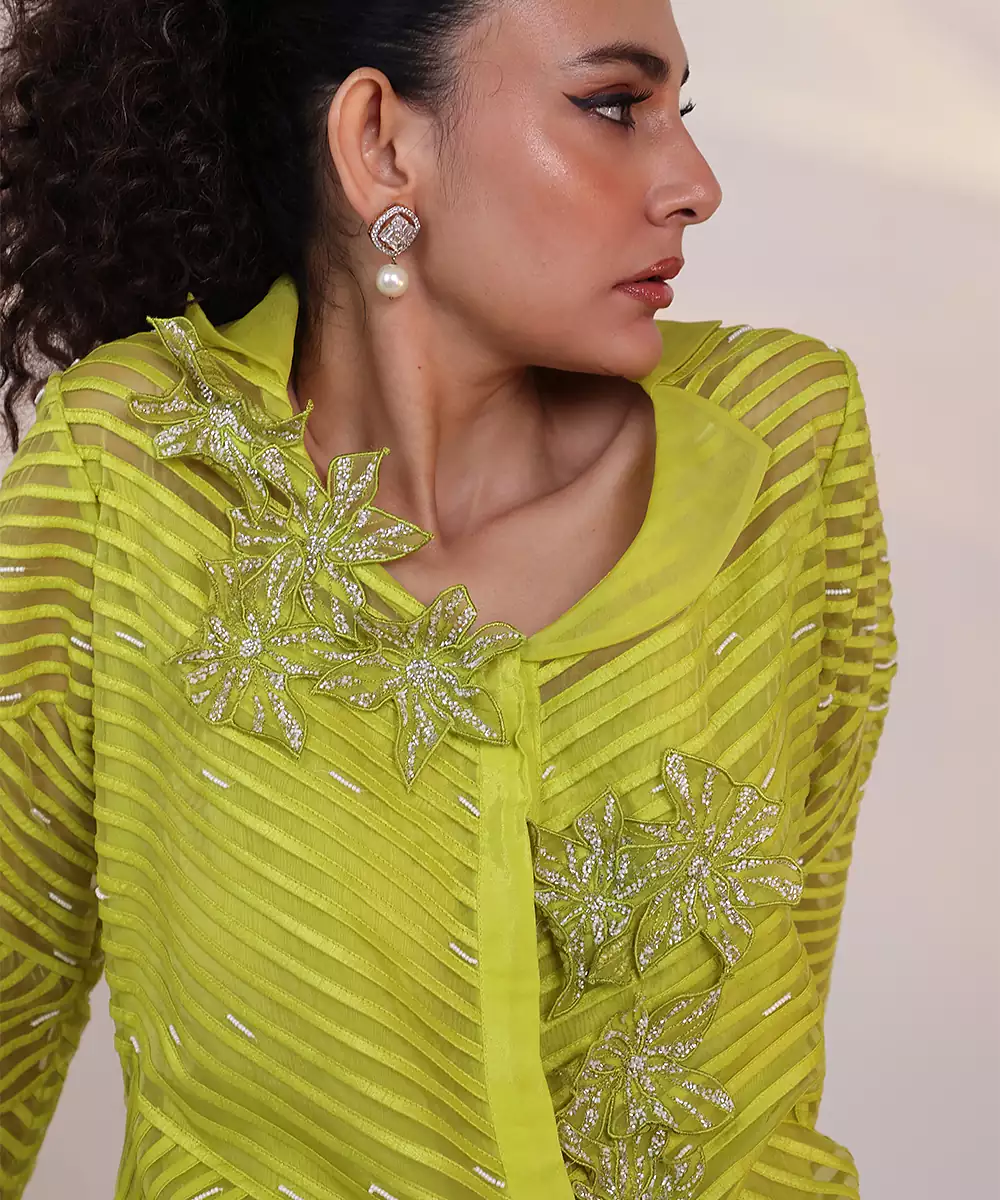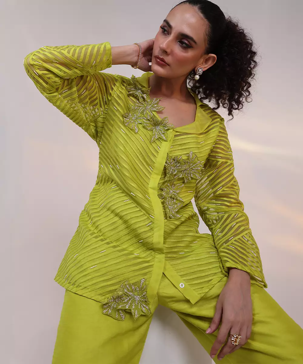 Refresh Your Festive Wardrobe With This Green Embroidered Organza Co Ord Set. Crafted In Sheer Organza, It Features Delicate Embroidery That Adds Refined Elegance. The Lightweight Silhouette And Coordinated Design Create A Modern Yet Graceful Look, Ideal For Festive Gatherings, Celebrations, And Evening Occasions.