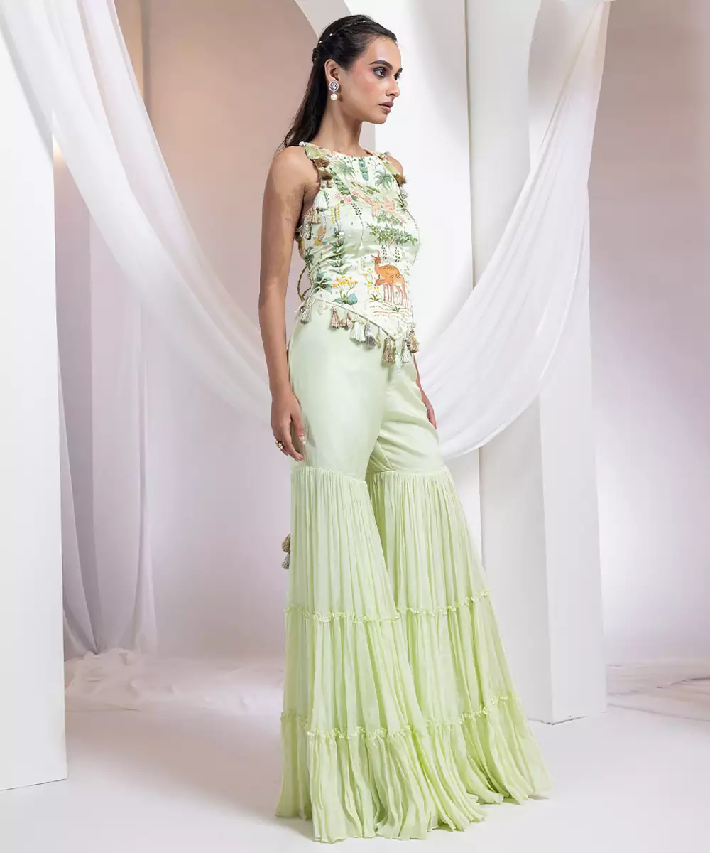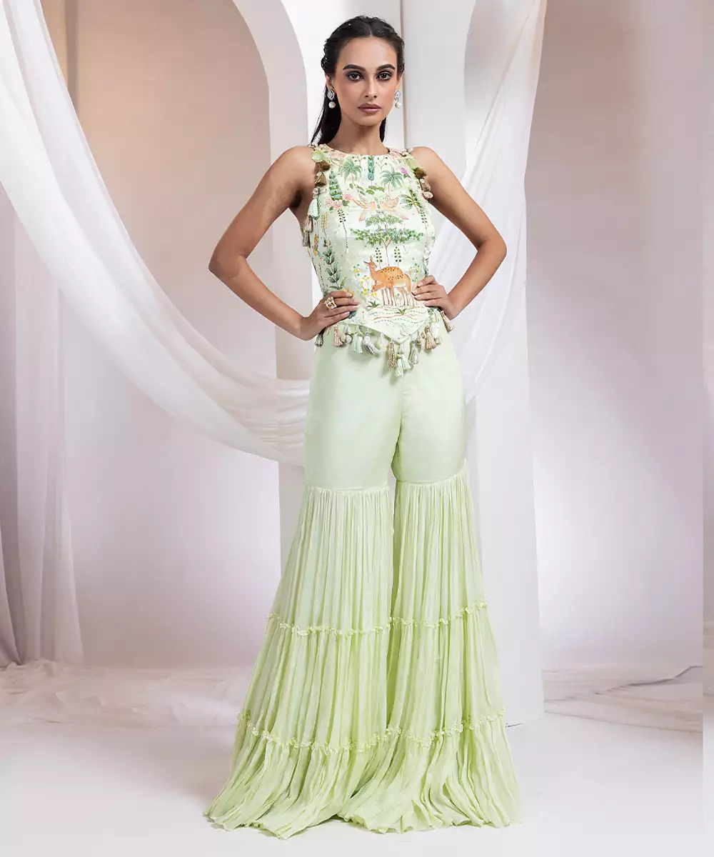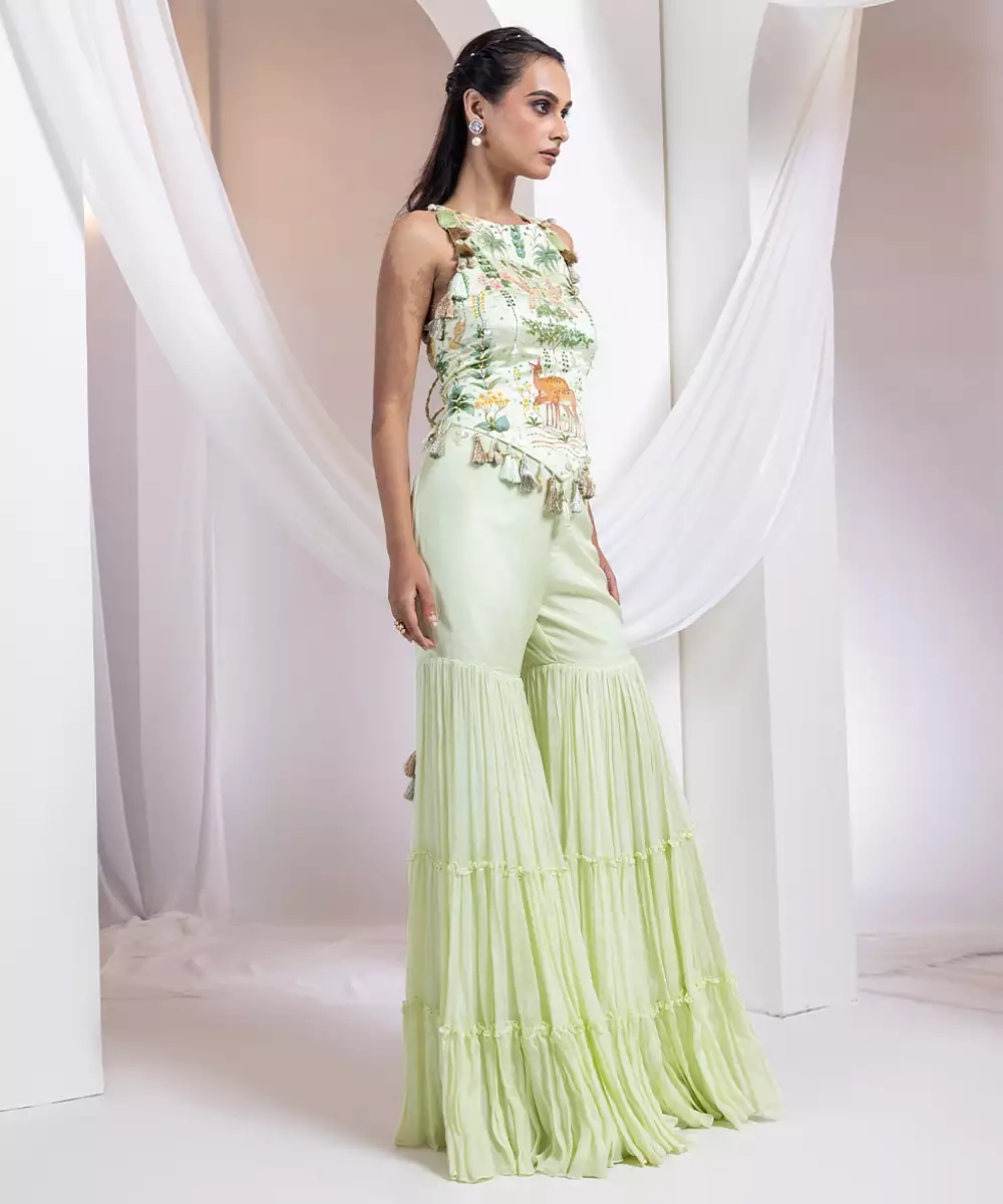 A Whimsical Two Piece Set In Light Lime Green, Where Forest Fables Come Alive. The Structured Corset Features Intricate Hand Painting Of Birds, Deer, And Lush Foliage, Elevated With Fine Threadwork And Bead Embroidery. Paired With Softly Tiered Flared Pants Detailed With Gentle Gathers And Drawstring Accents, The Look Blends Storybook Charm With A Contemporary Silhouette.