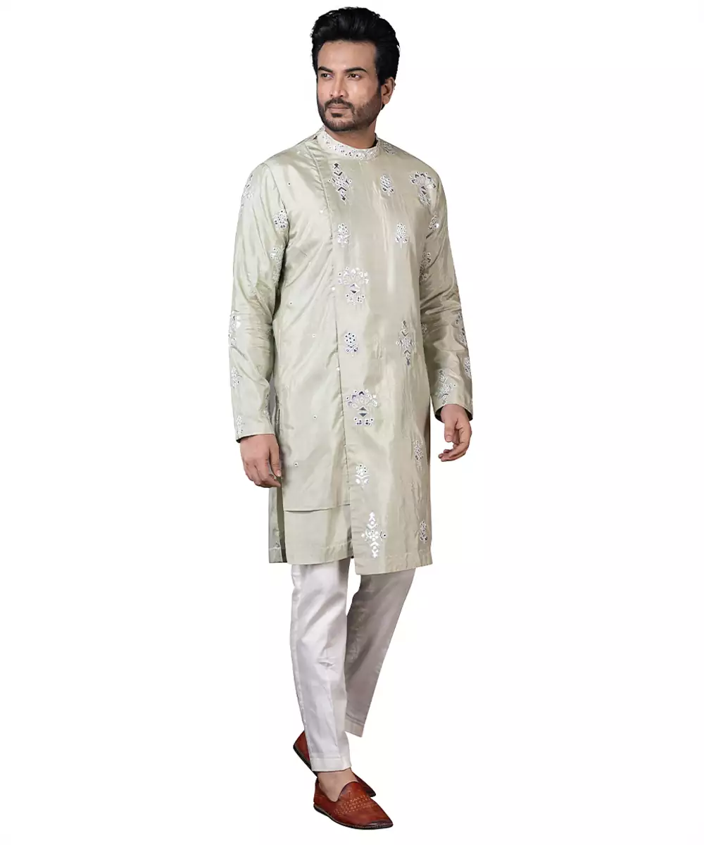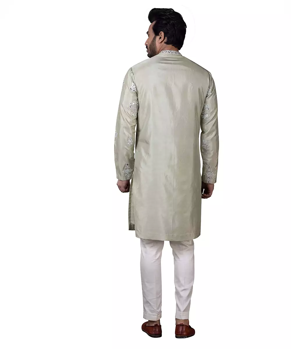 This Green Embroidered Silk Kurta Pajama Blends Timeless Elegance With Festive Charm. Crafted From Luxurious Silk, It Features Intricate Embroidery That Enhances Its Sophisticated Appeal. The Tailored Kurta Paired With A Classic Pajama Ensures A Graceful, Polished Silhouette, Making It Perfect For Weddings, Celebrations, Or Special Cultural Occasions.