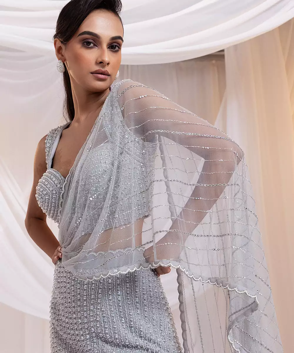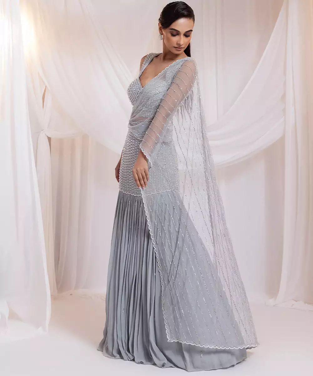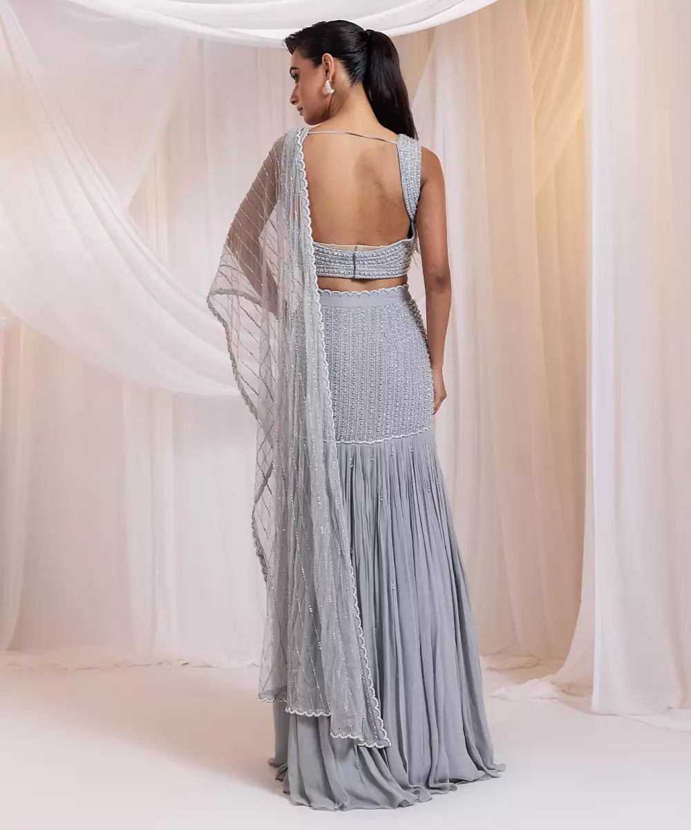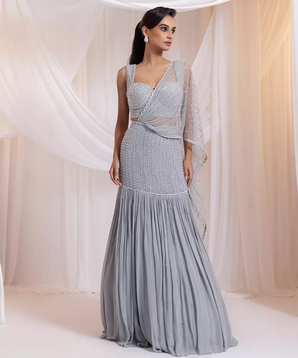 This Grey Embroidered Georgette Lehenga Set Exudes Understated Elegance With Its Lightweight, Flowing Fabric And Beautifully Flared Silhouette. Delicate Embroidery Adds A Festive, Artisanal Touch, Enhancing Its Modern Ethnic Charm. Perfect For Weddings, Celebrations, And Special Occasions, It Blends Comfort With Sophistication, Creating A Stylish And Timeless Ensemble.