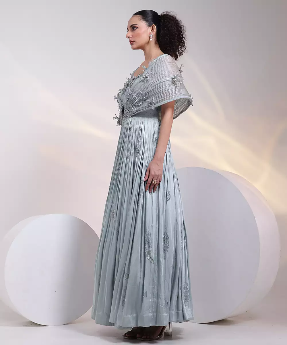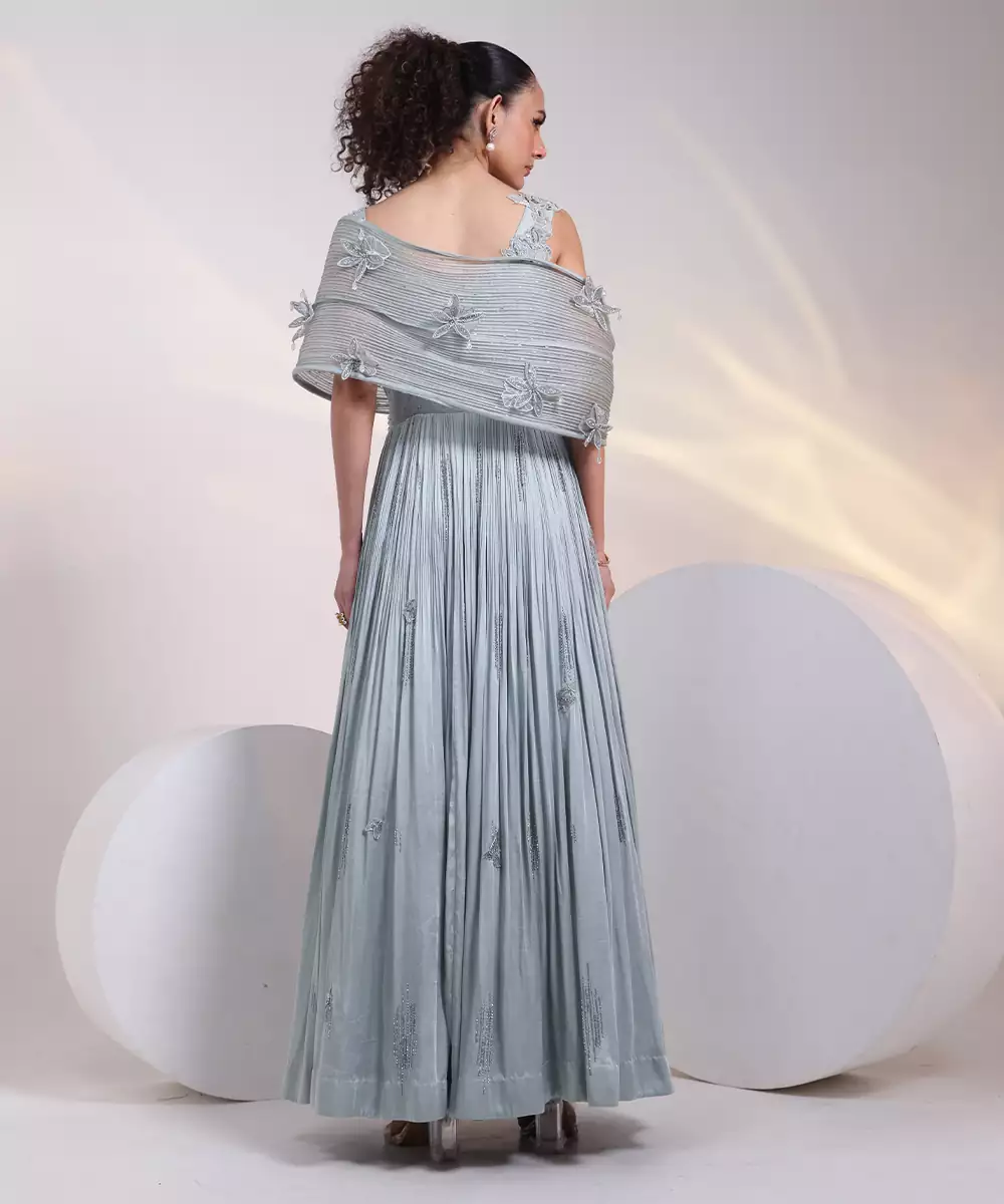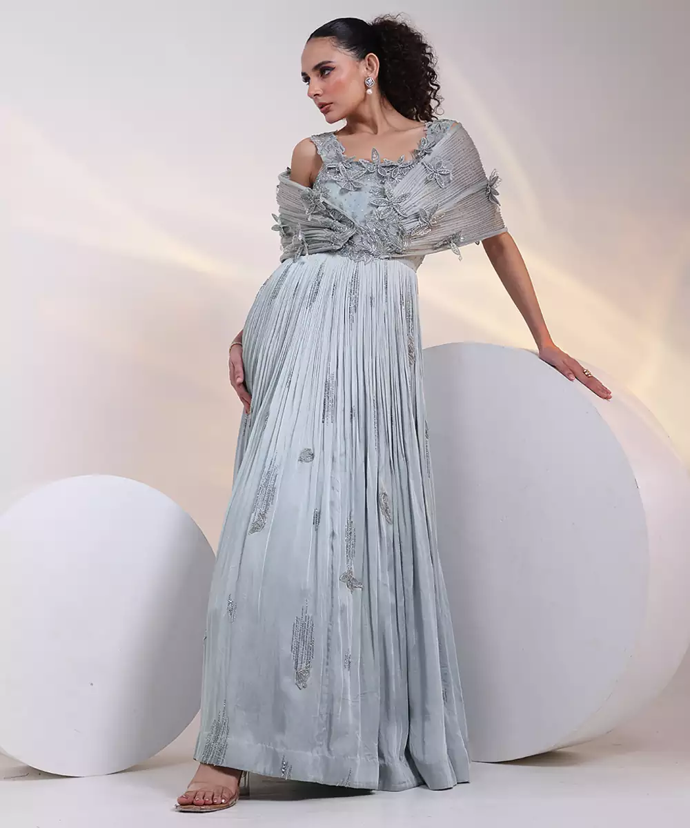 The Grey Embroidered Satin Gown Is A Perfect Blend Of Grace And Modern Luxury. Crafted From Smooth Satin, It Features Delicate Embroidery That Adds Refined Detail And Texture. The Flowing Silhouette Enhances Elegance, Making It Ideal For Evening Occasions, Festive Gatherings, And Sophisticated Celebrations.