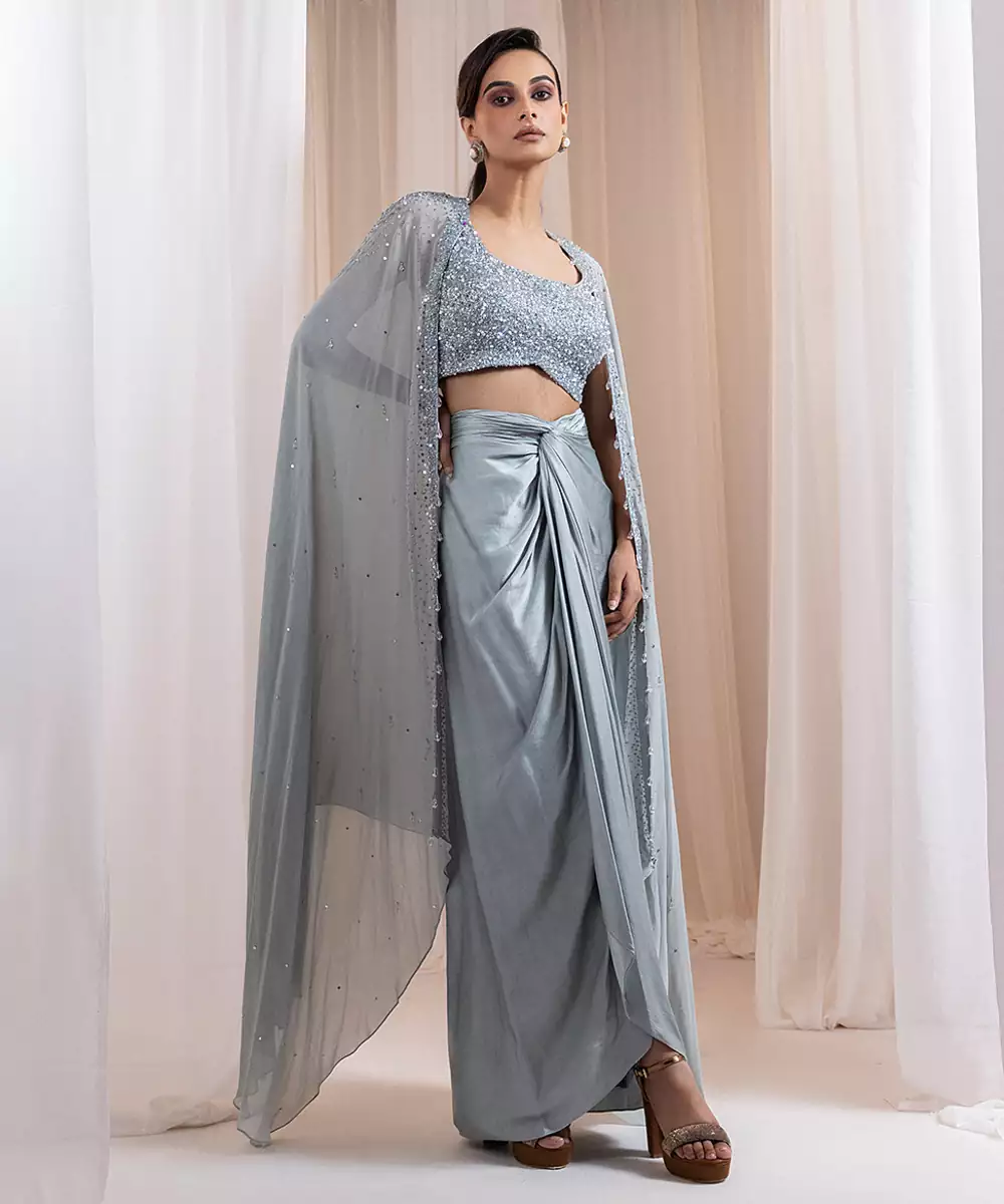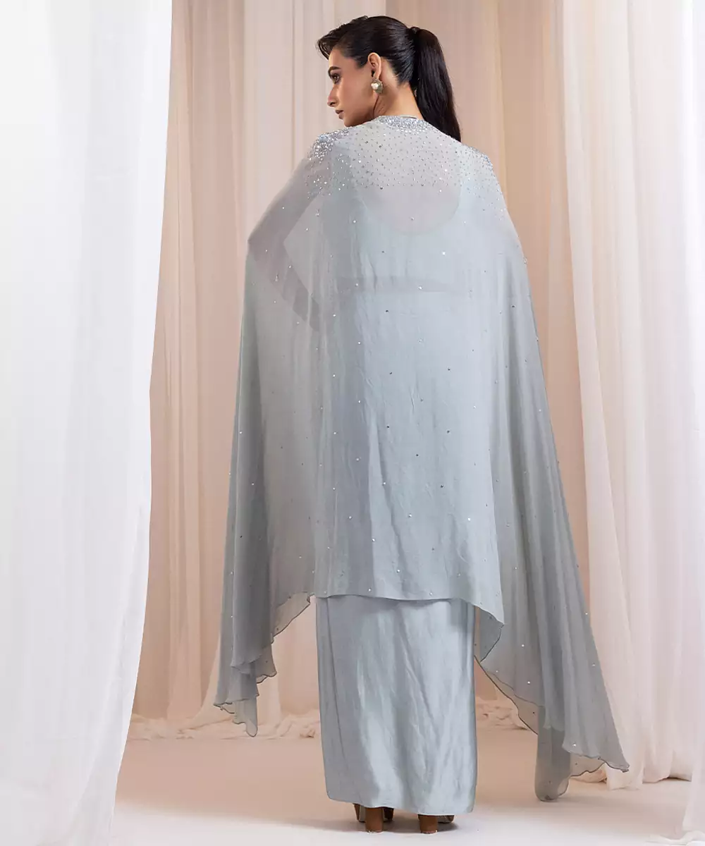 This Grey Embroidered Silk Co Ord Set Exudes Timeless Elegance With Its Luxurious Sheen And Smooth Drape. Delicate Embroidery Adds Refined Artistry, Elevating Its Sophisticated Appeal. Perfect For Celebrations, Evening Events, And Festive Gatherings, It Blends Comfort With Contemporary Style, Creating A Polished And Effortlessly Graceful Ensemble.