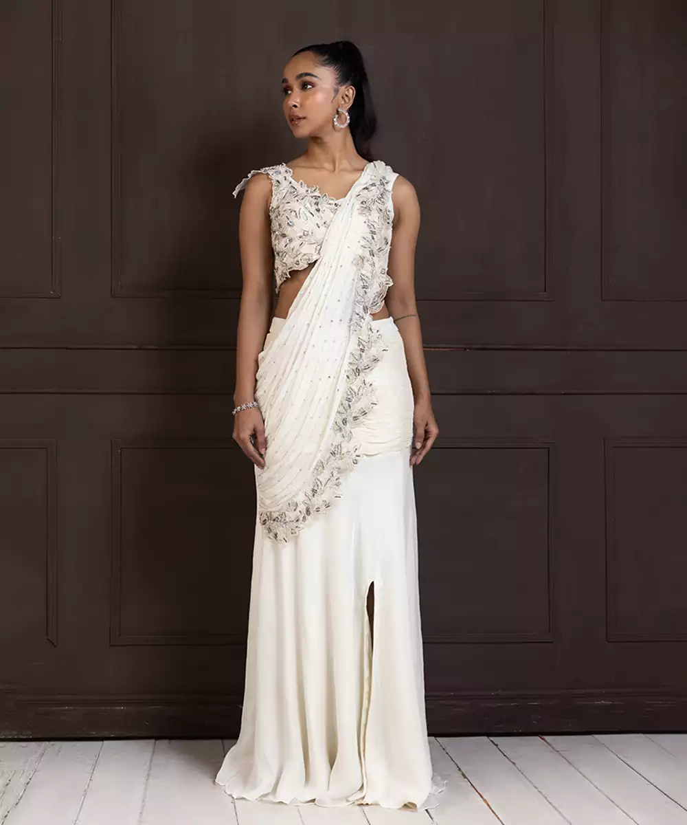 Embrace Timeless Elegance With This Ivory Draped Saree Gown, Featuring A Beautifully Embellished Blouse Adorned With Delicate Floral Appliqués And Beadwork. The Fluid Silhouette Combines Traditional Saree Elements With A Contemporary Gown Design, Highlighted By A Subtle Front Slit For Added Sophistication. Perfect For Weddings, Cocktail Events, Or Evening Soirées, This Ensemble Offers Effortless Charm And Grace.