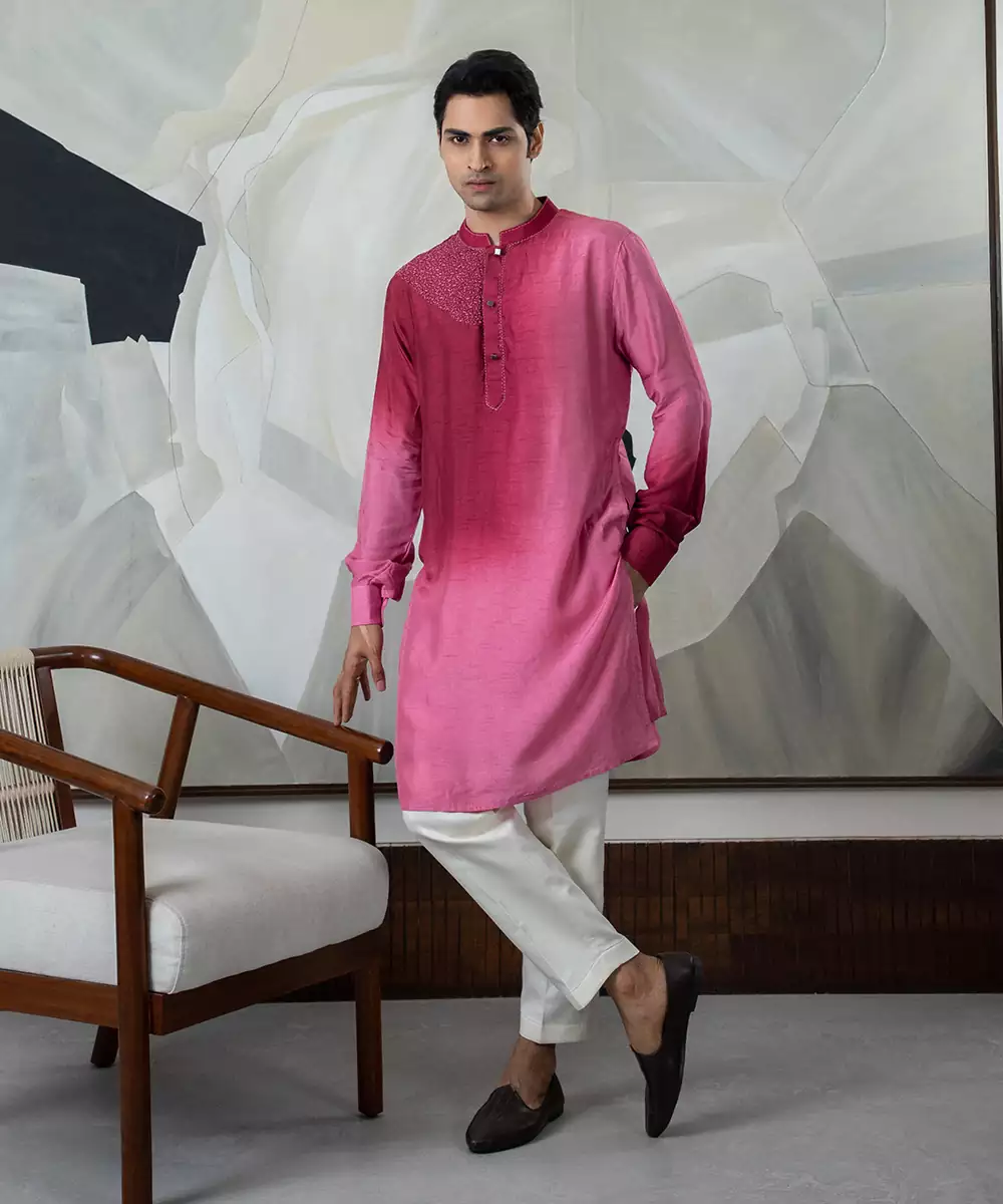 Sport The Ethnic Look With This Ombre Kurta Dyed In Peach And Maroon. Comes With An Ivory Pant Pajama.