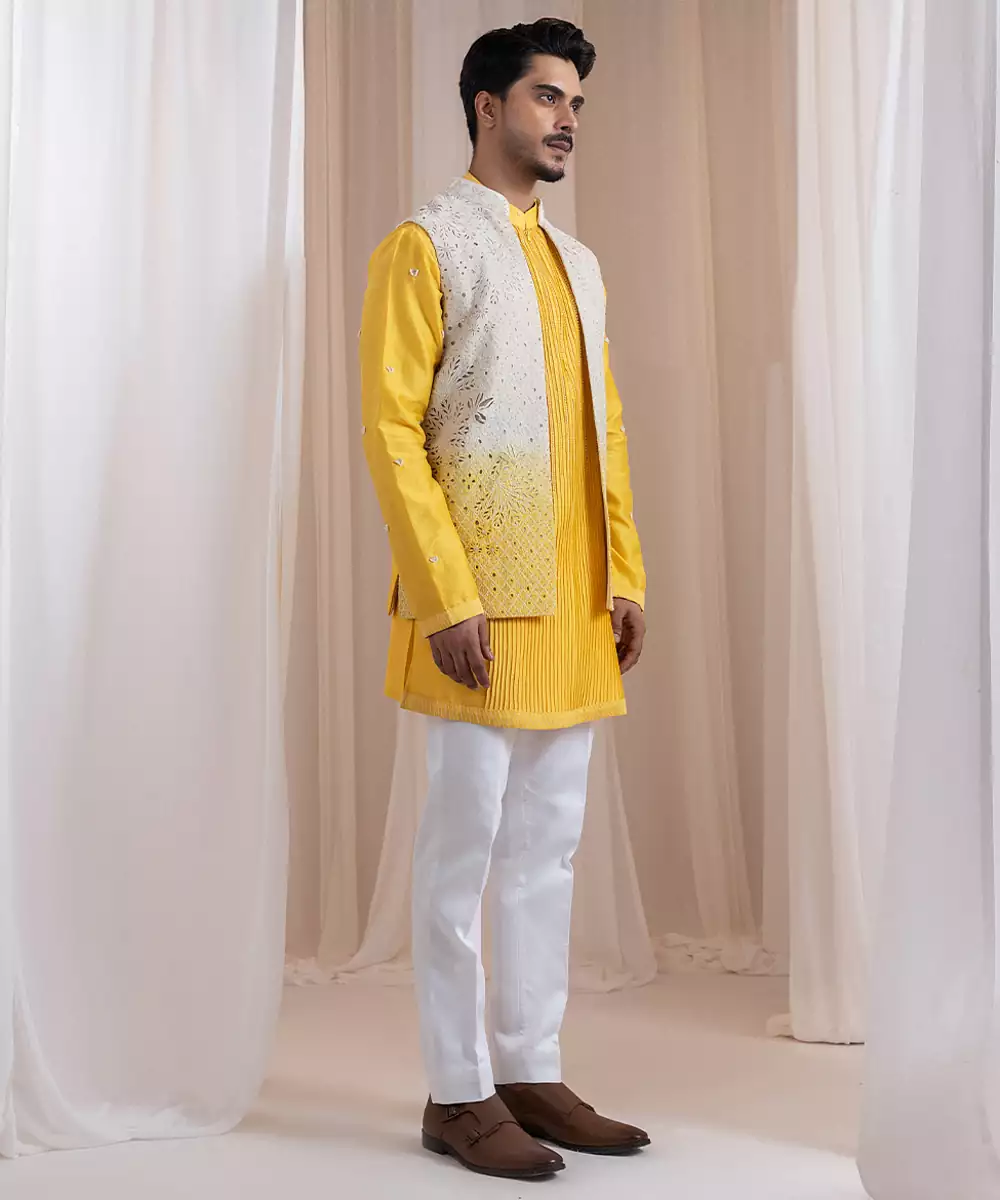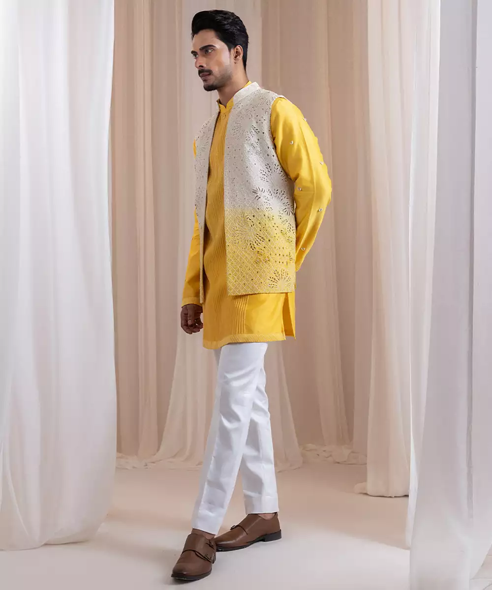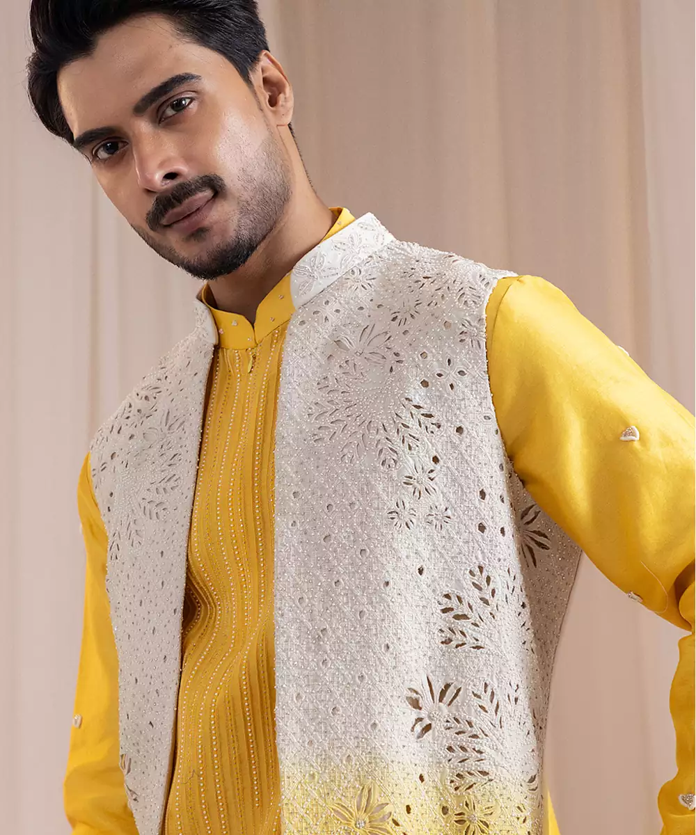 This Multicolor Embroidered Chanderi Nehru Jacket Exudes Festive Elegance And Contemporary Charm. Crafted From Lightweight Chanderi Fabric, It Features Intricate Multicolor Embroidery That Enhances Its Refined Appeal. Perfect For Weddings, Celebrations, Or Cultural Events, It Adds A Vibrant, Stylish Touch To Ethnic Ensembles With Timeless Sophistication And A Polished Silhouette.
