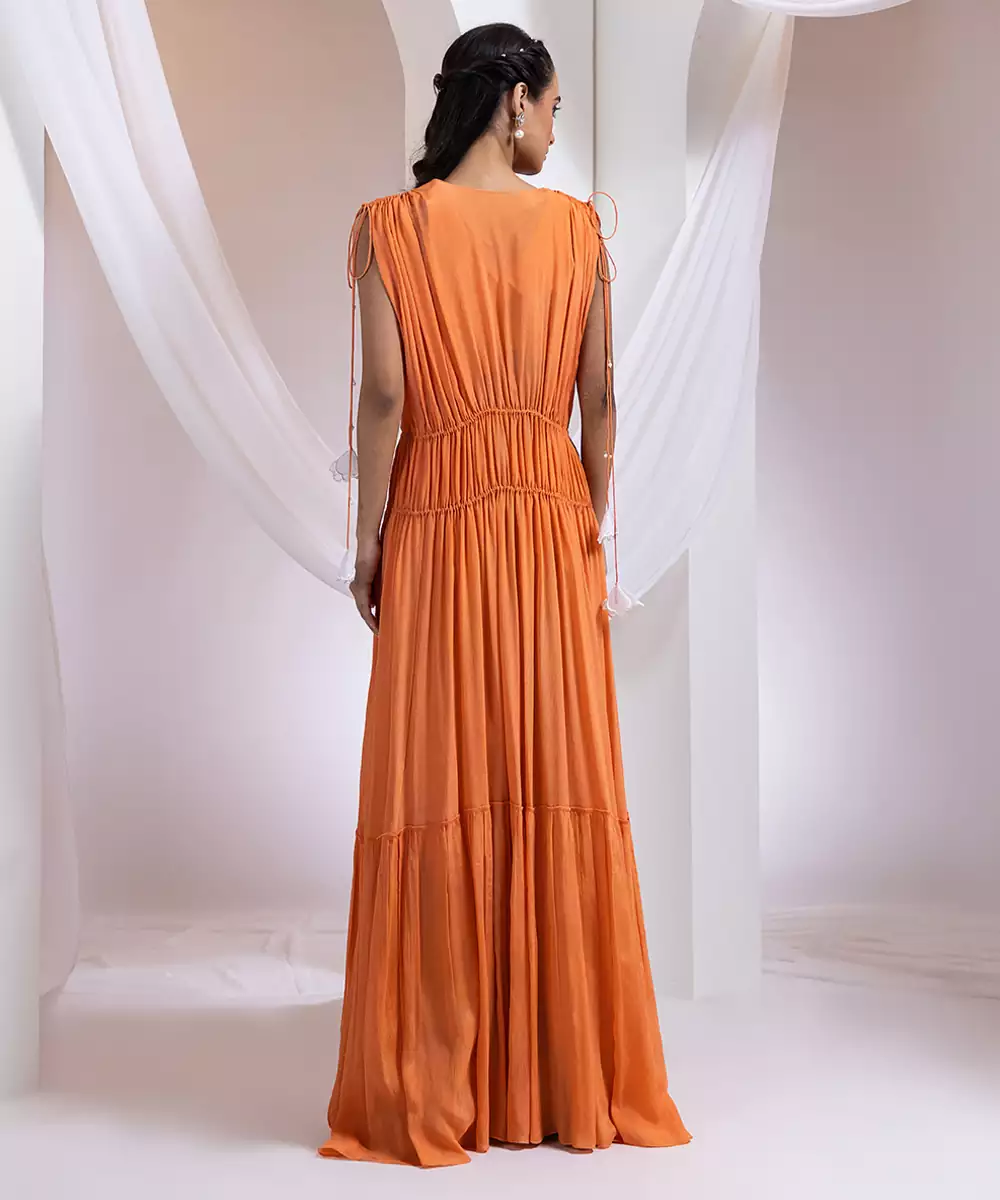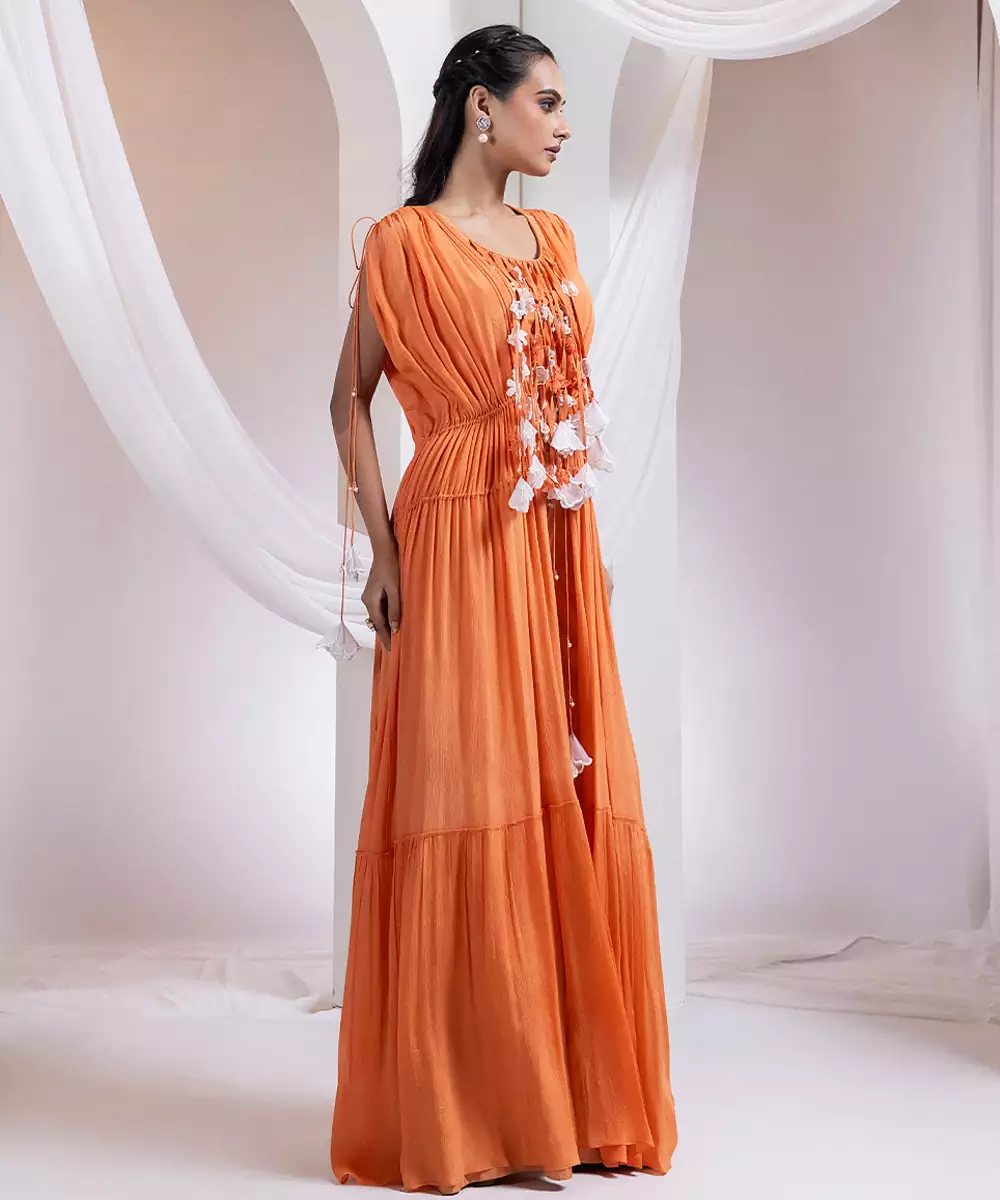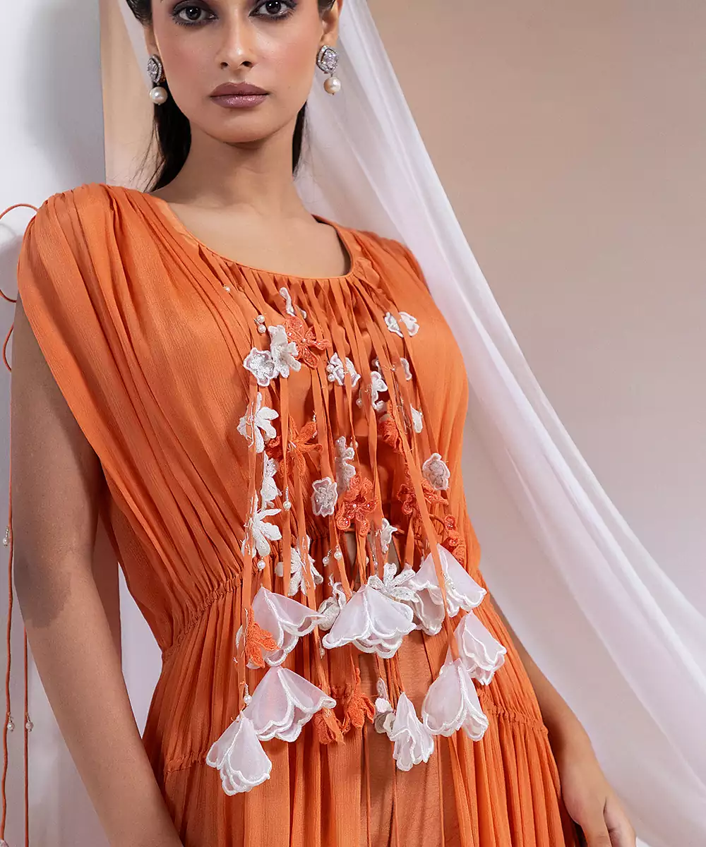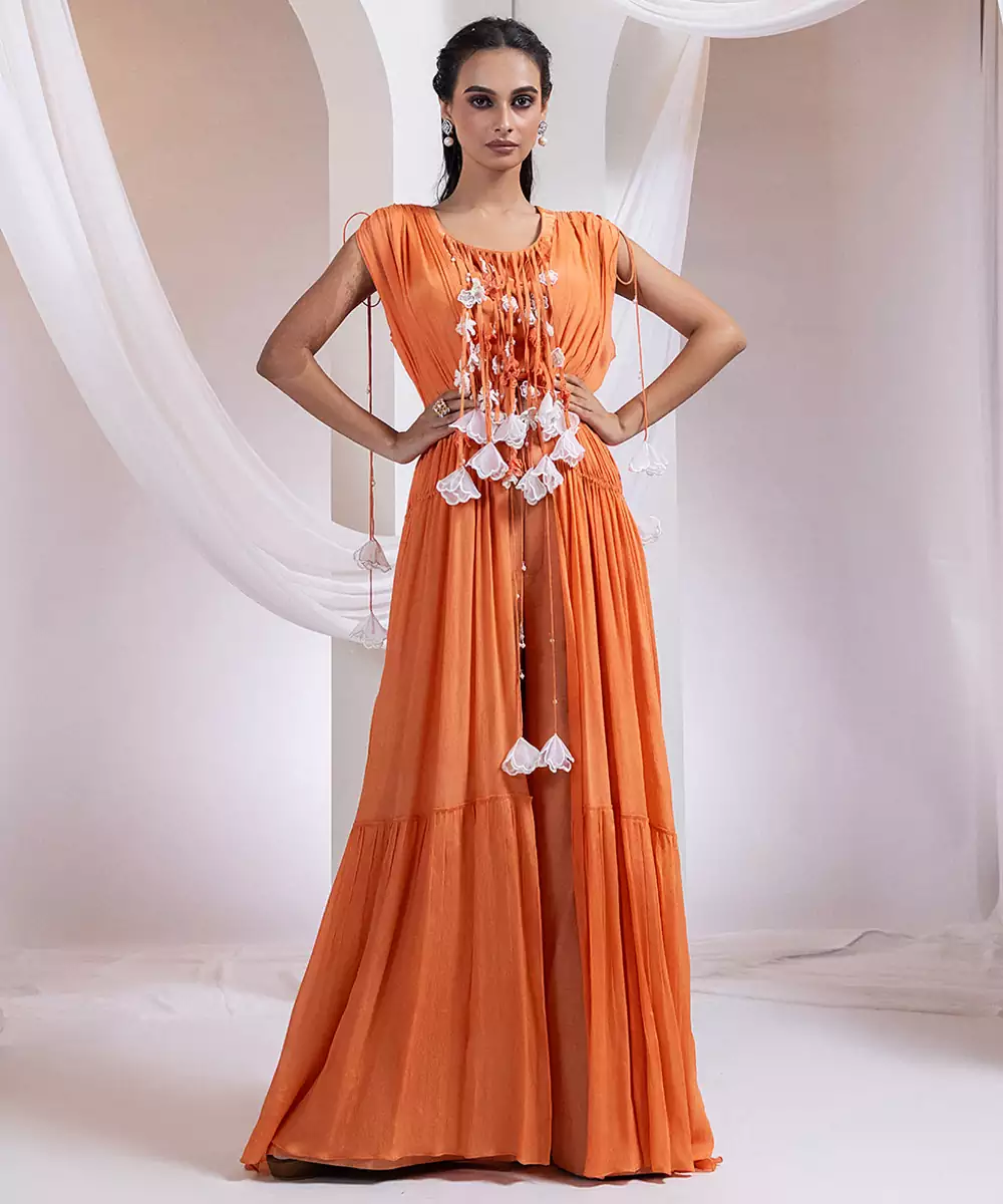 This Orange Embroidered Crepe Co Ord Set Radiates Vibrant Elegance With Its Smooth, Lightweight Fabric And Graceful Drape. Intricate Embroidery Adds A Festive, Artistic Charm, Elevating Its Lively Hue. Perfect For Celebrations, Parties, And Traditional Gatherings, It Blends Modern Style With Effortless Sophistication For A Standout Ensemble.