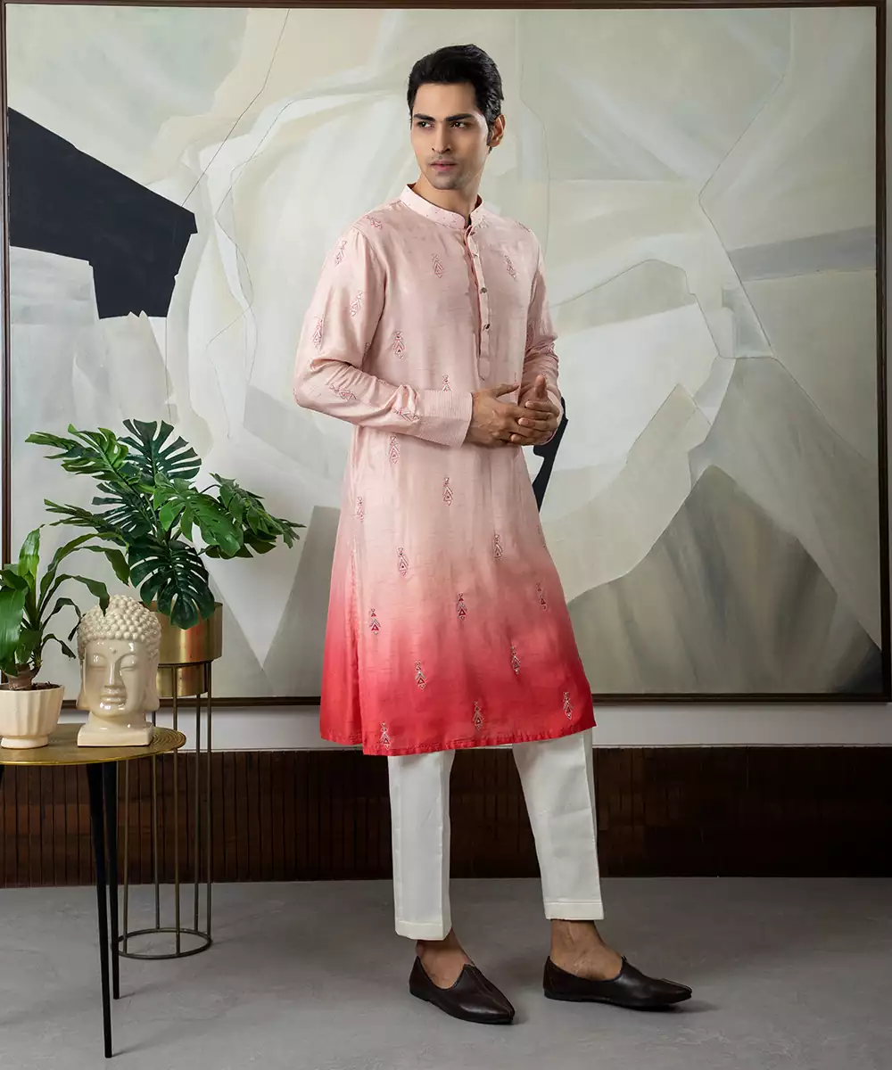 Shades Of Pink And Peach Create A Cohesive Union Of Colors In This Traditional Kurta. The Geometric Butis On This Ombre Kurta Adds A Touch Of Drama To Your Wardrobe. Pair It With Jeans Or Keep It Traditional With Pajama Pants. Comes With An Ivory Pant Pajama.
