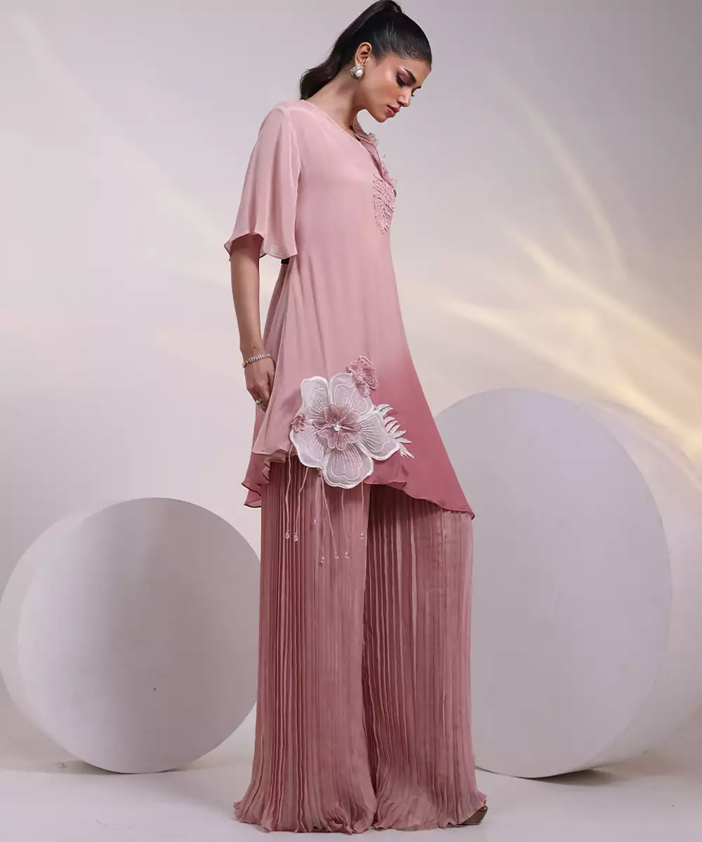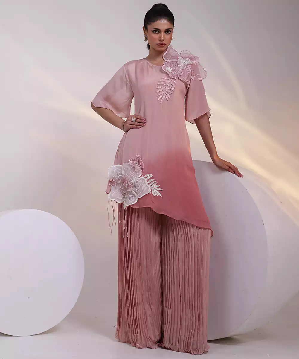 This Pink Embroidered Chinon Co Ord Set Exudes Feminine Charm And Graceful Elegance. Crafted In Flowy Chinon Fabric, It Features Delicate Embroidery That Enhances Its Refined Appeal. The Coordinated Silhouette Offers Comfort With Style, Making It Perfect For Festive Occasions, Celebrations, And Elegant Daytime Events.