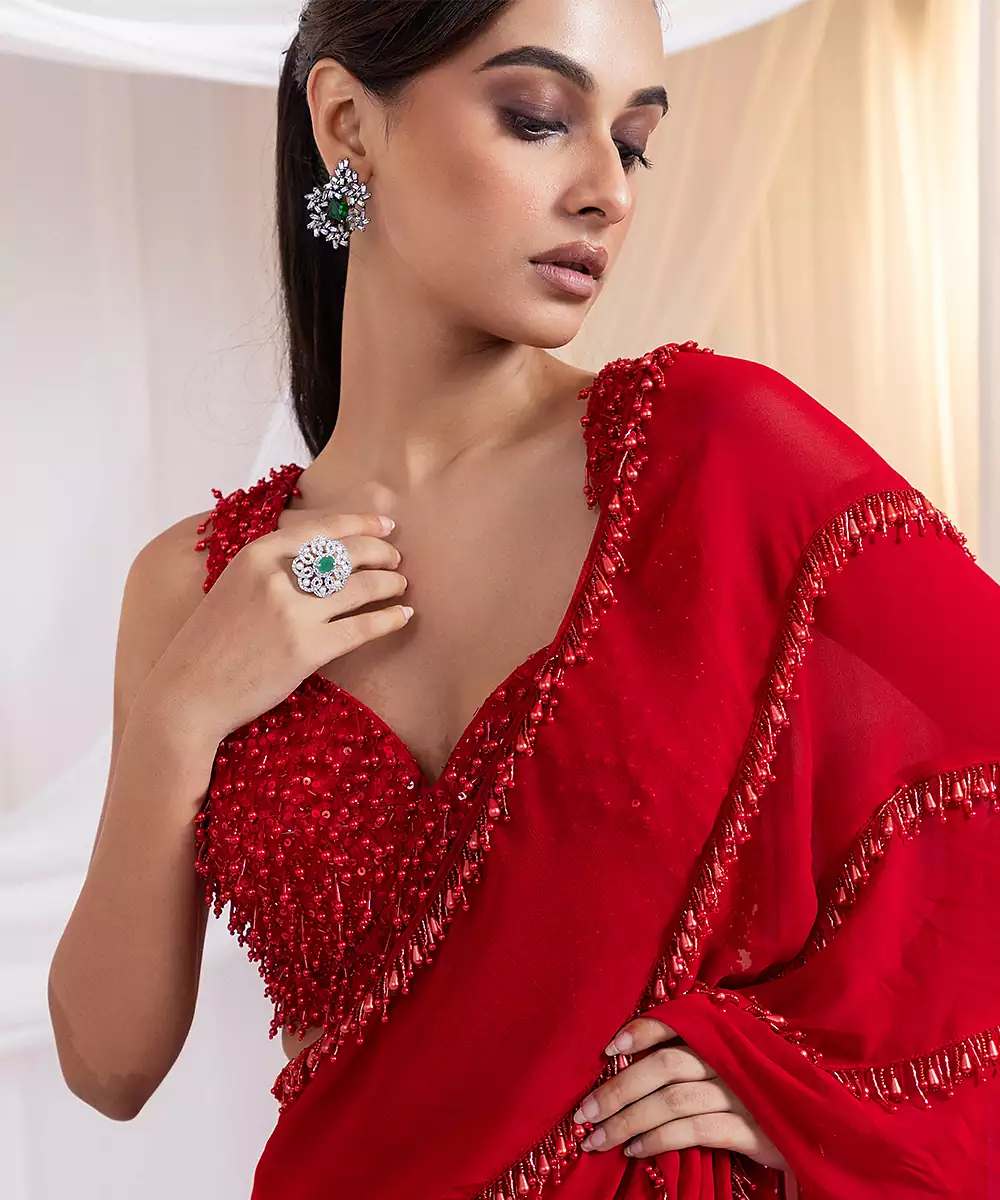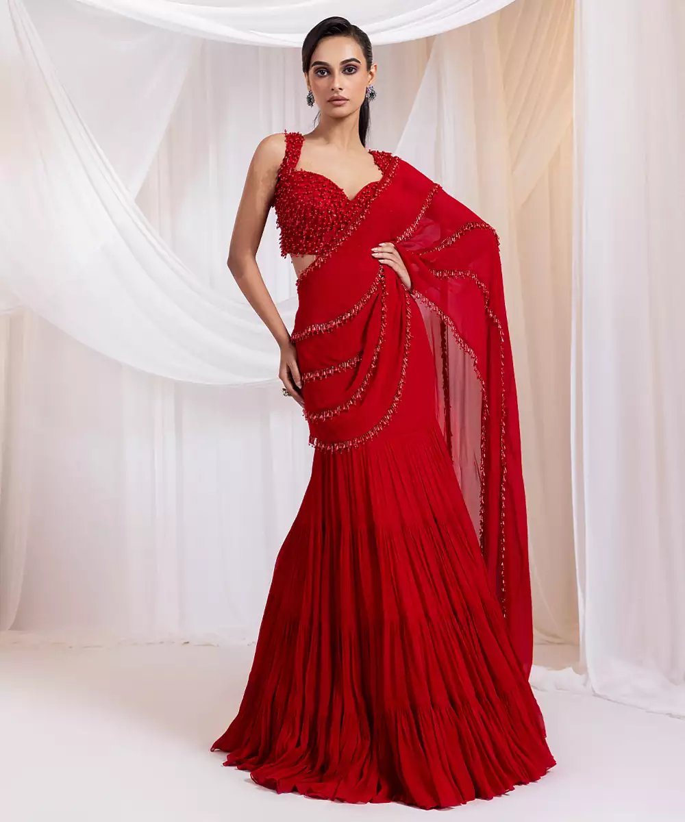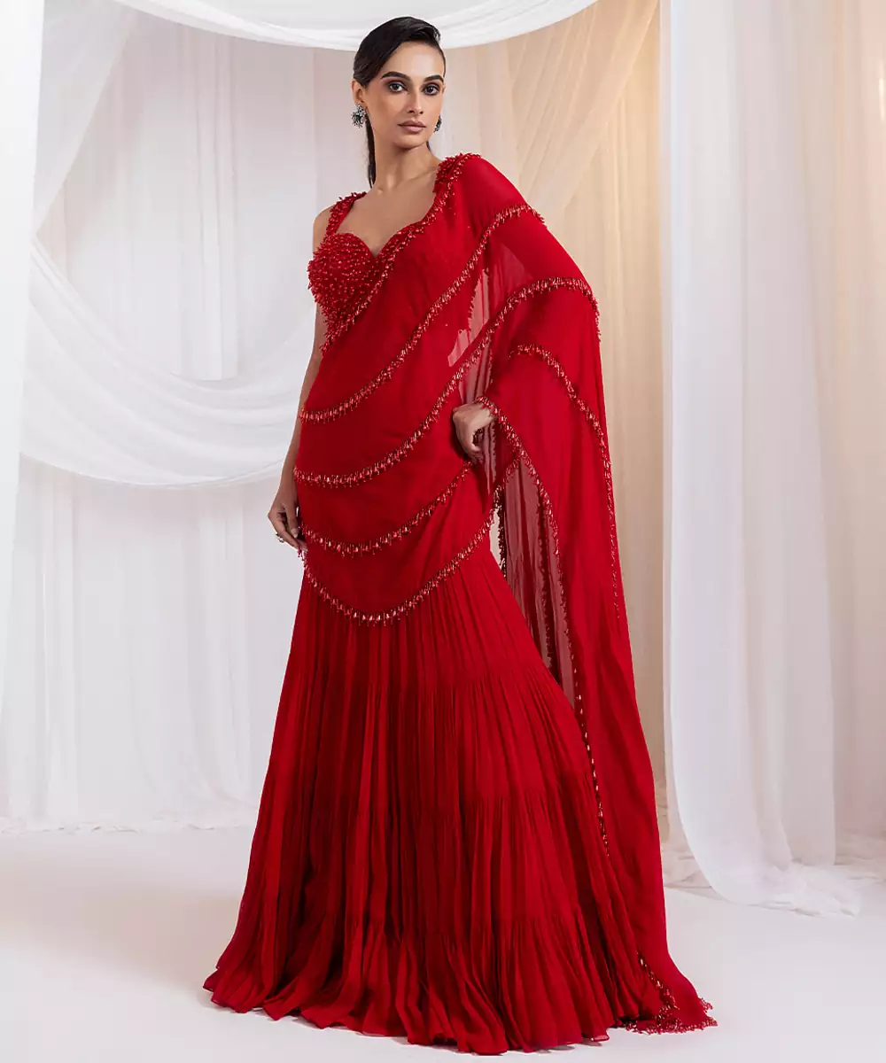 This Red Embroidered Silk Saree Exudes Luxurious Elegance With Its Lustrous Sheen And Graceful Drape. Designed In A Lehenga Style Pattern, It Offers A Contemporary Festive Twist. Intricate Embroidery Enhances Its Rich Hue, Making It Perfect For Weddings, Celebrations, And Special Occasions, Blending Timeless Sophistication With Modern Ethnic Charm.