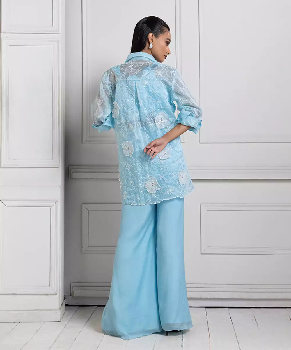Elevate Your Style With This Serene Powder Blue Co Ord Set, Featuring A Lightweight, Sheer Jacket Adorned With Intricate Floral Embroidery. The Matching Top And Palazzo Pants Offer A Relaxed Yet Sophisticated Silhouette, Making It Perfect For Brunches, Summer Soirées, Or Daytime Celebrations. This Ensemble Is A Harmonious Blend Of Comfort And Elegance, Ideal For Those Seeking A Graceful And Modern Look.