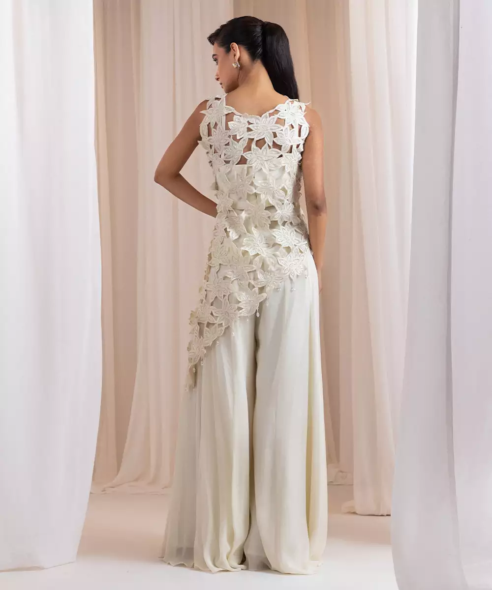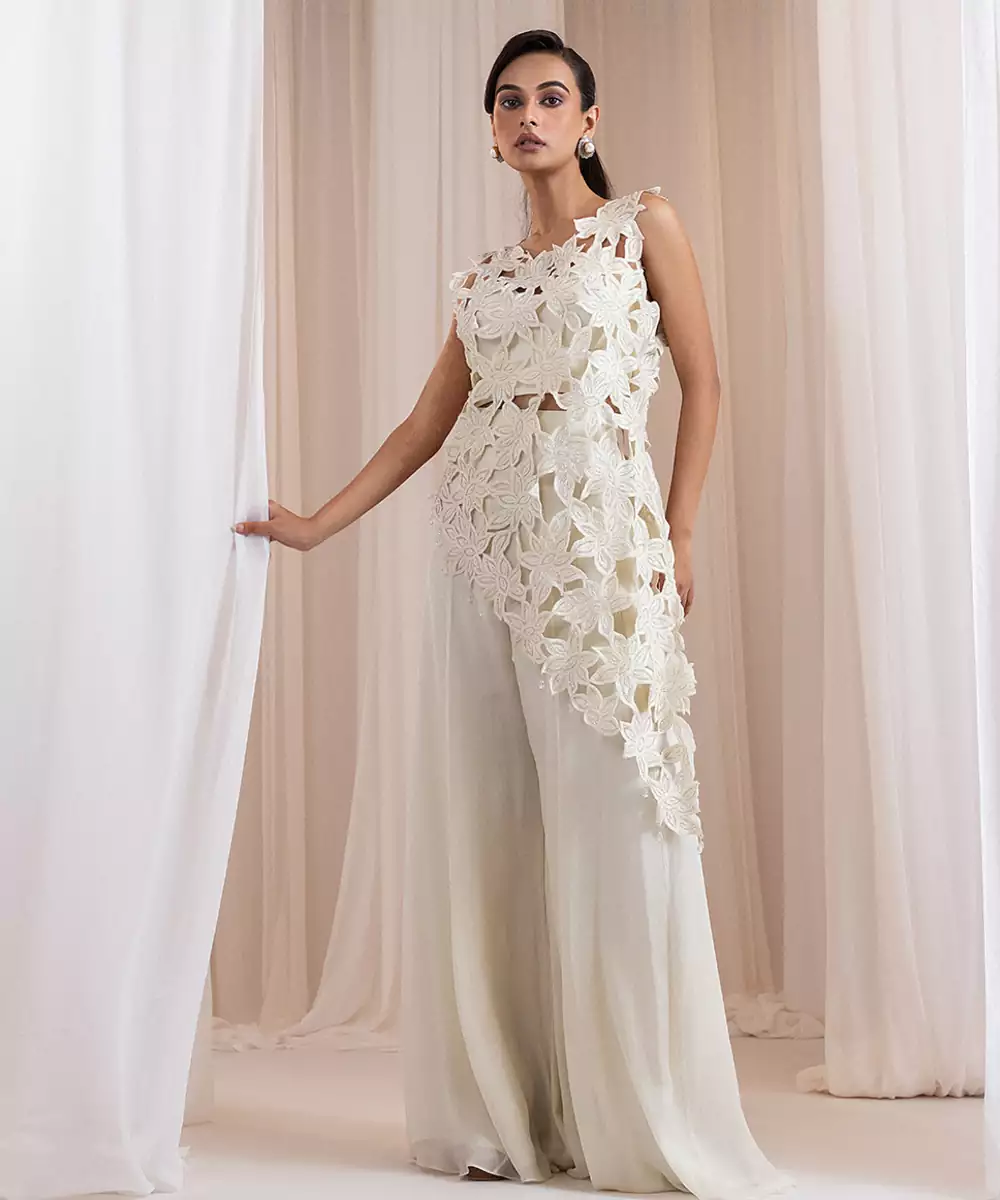 This White Embroidered Chinon Co Ord Set Exudes Serene Elegance With Its Soft Sheen And Fluid Drape. The Lightweight Chinon Fabric Ensures Comfort, While The Intricate Embroidery Adds A Refined Festive Touch. Perfect For Celebrations, Evening Events, And Special Gatherings, It Blends Sophistication With Effortless Modern Style For A Stunning Look.
