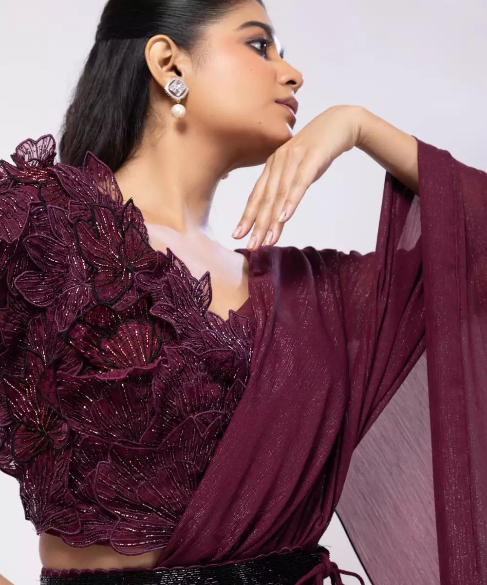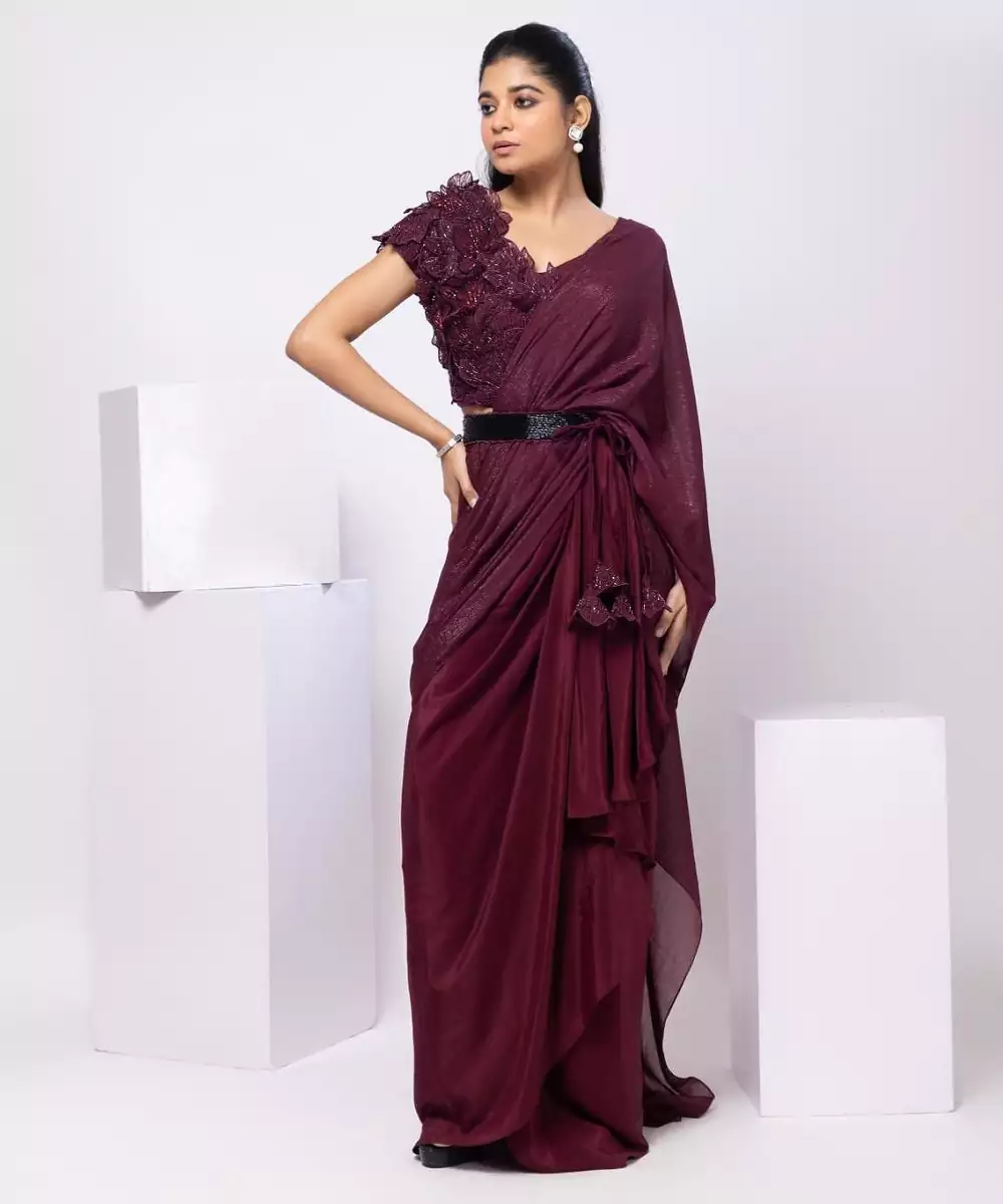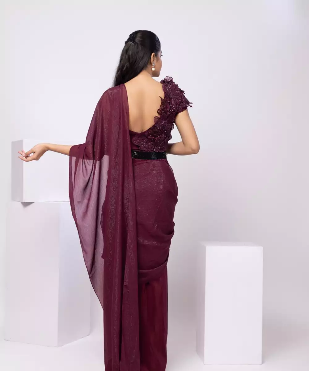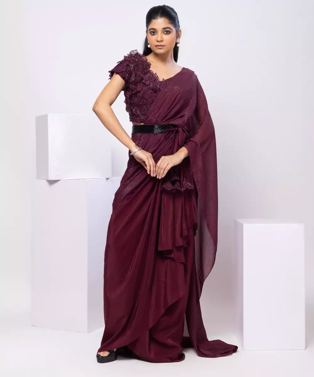 This Wine Plain Crepe Saree With Belt Exudes Modern Elegance And Sophistication. Crafted From Soft, Flowy Crepe Fabric, It Features A Sleek Plain Design Enhanced With A Stylish Belt For A Contemporary Touch. Perfect For Parties, Weddings, And Festive Occasions, It Offers A Graceful Yet Fashionable Ethnic Look.