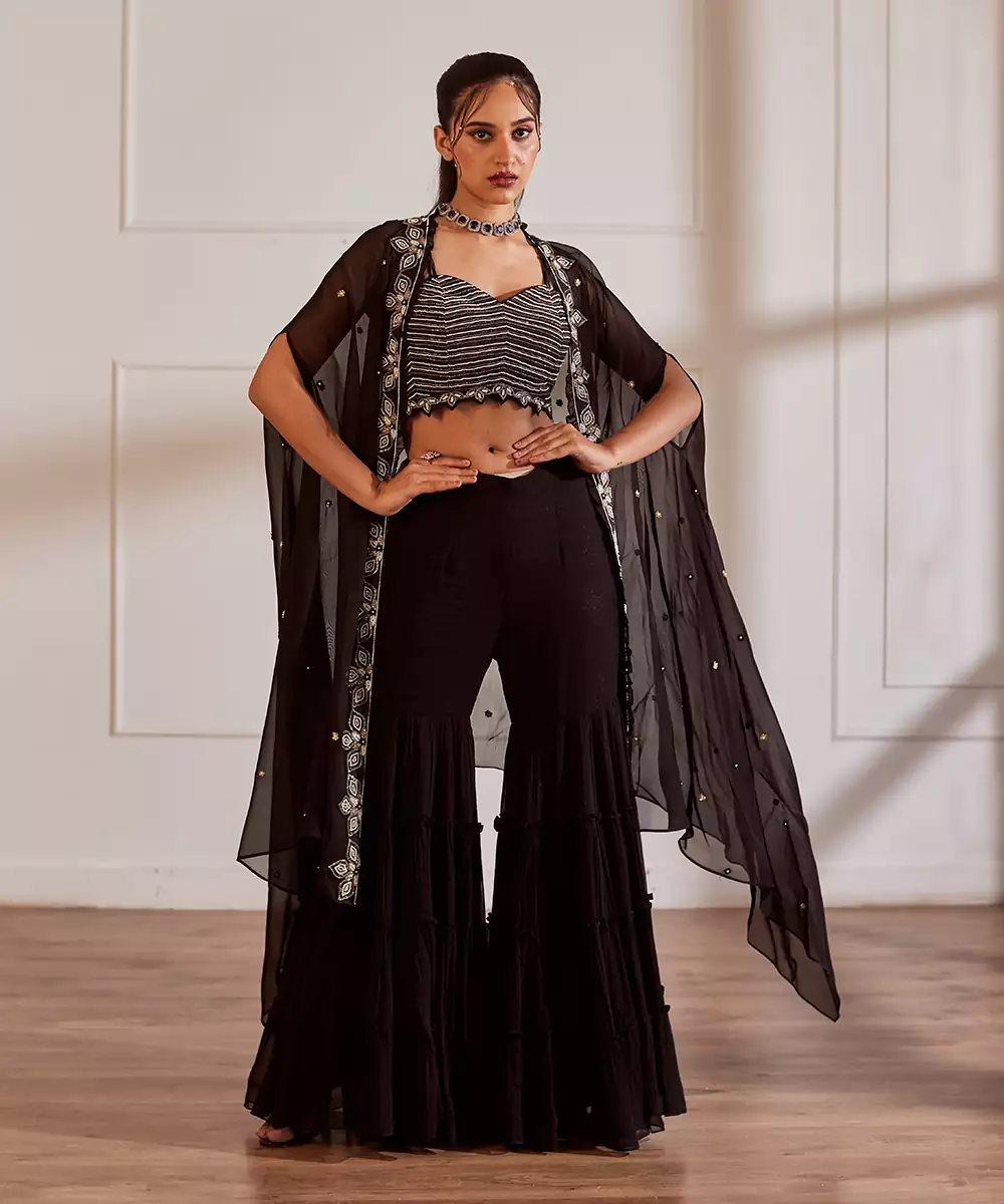 Black Croptop And Layered Gharara Paired Up With Organza Embellished Cape.