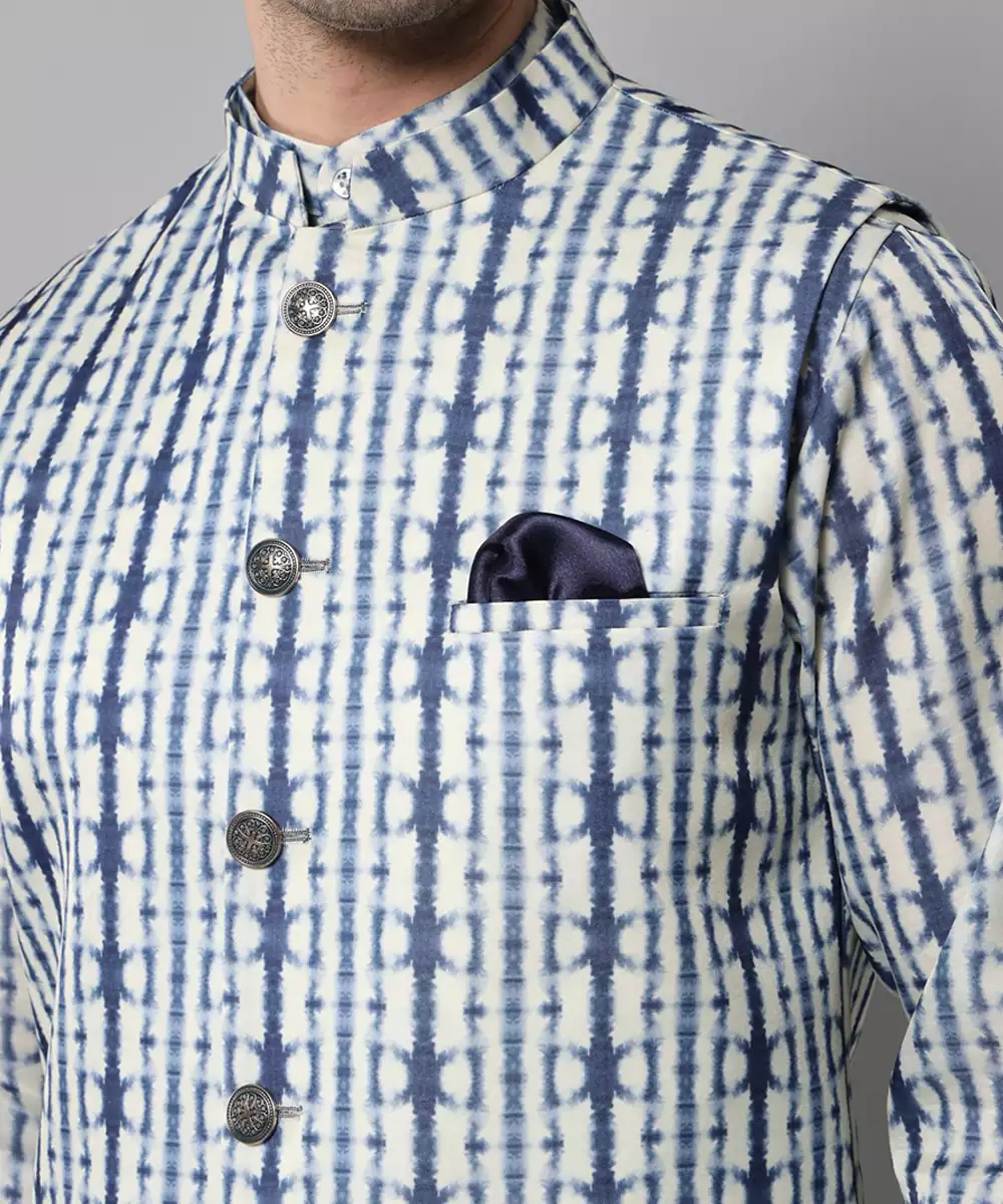 Wrinkle Free White And Blue Tie Dye Kurta Jacket Set