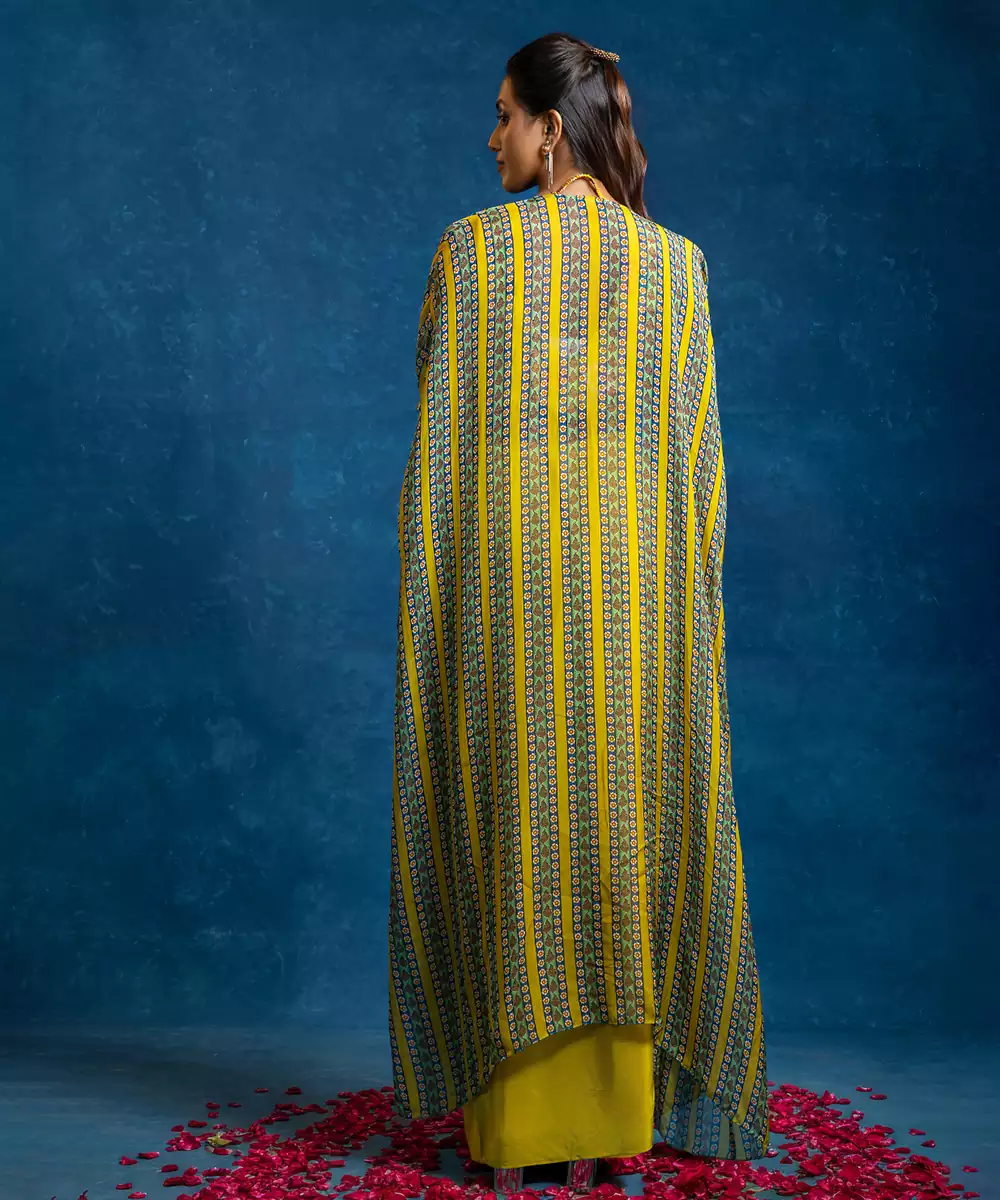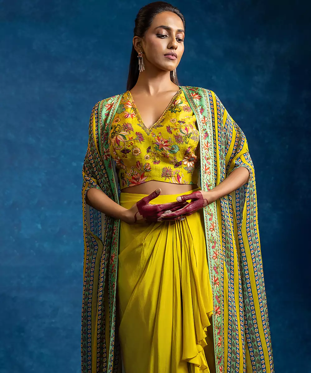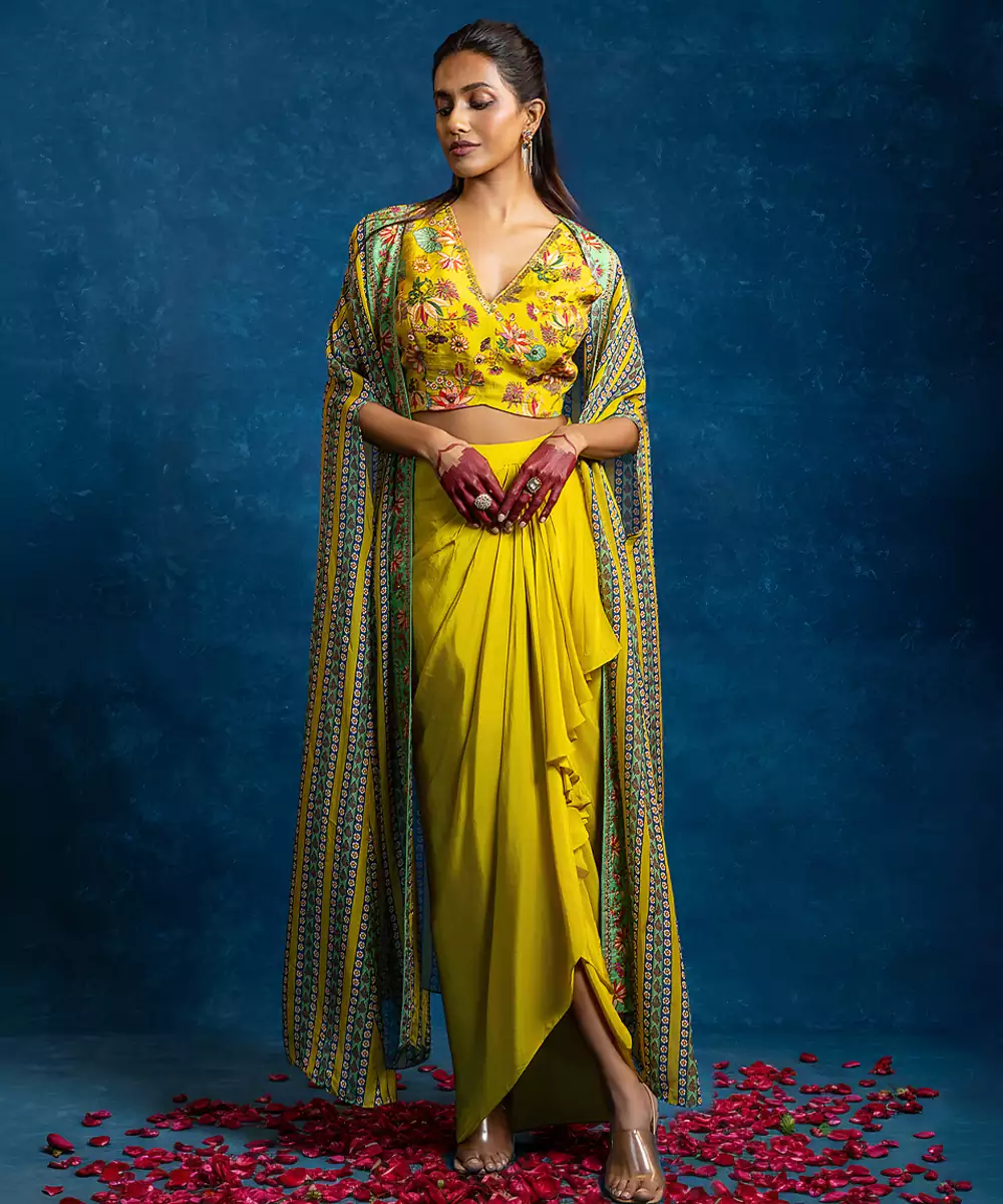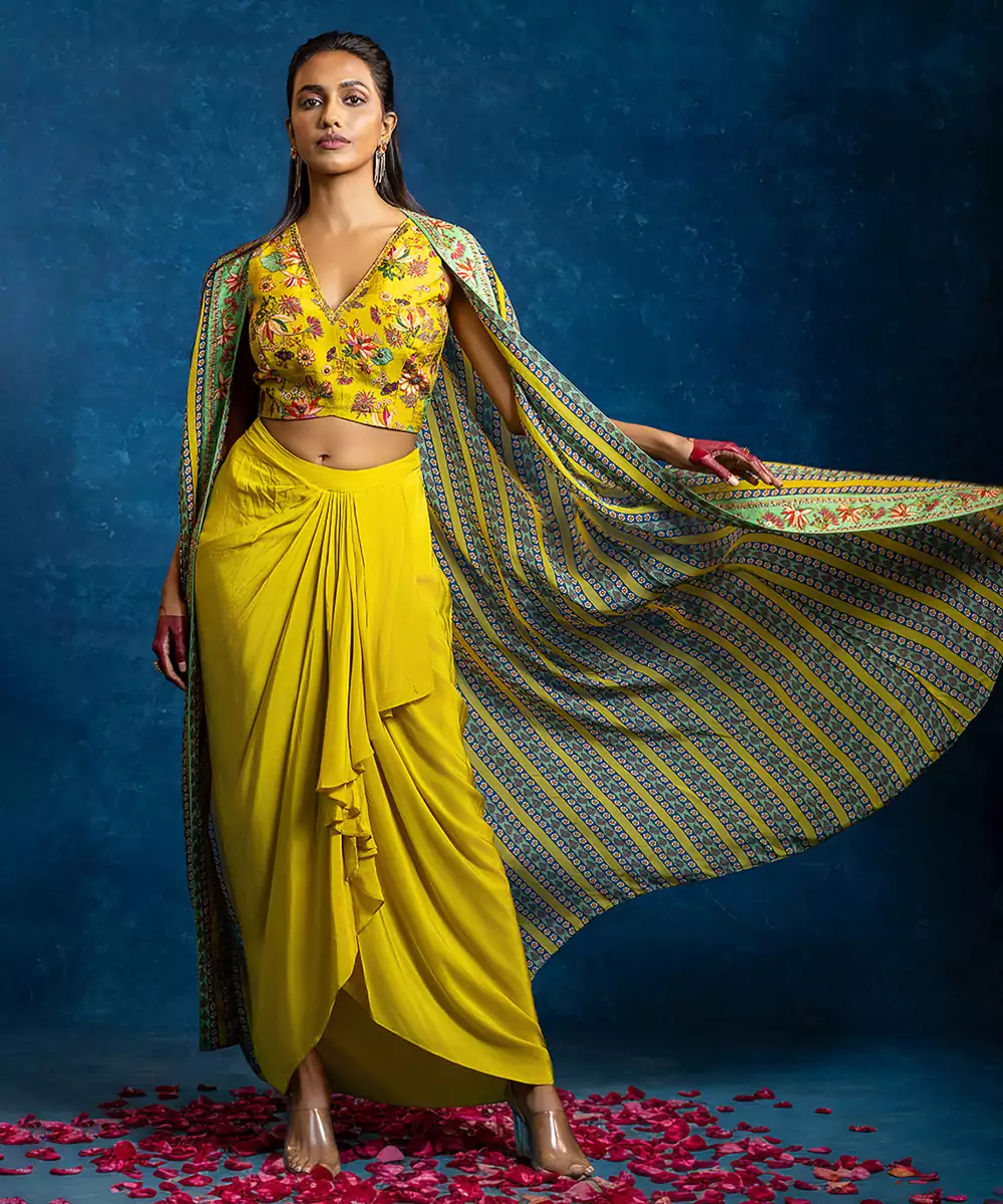 Beige Rangtara Embellished Bustier And Layred Pants, Paired With Front Tie Up Cape In Organza.