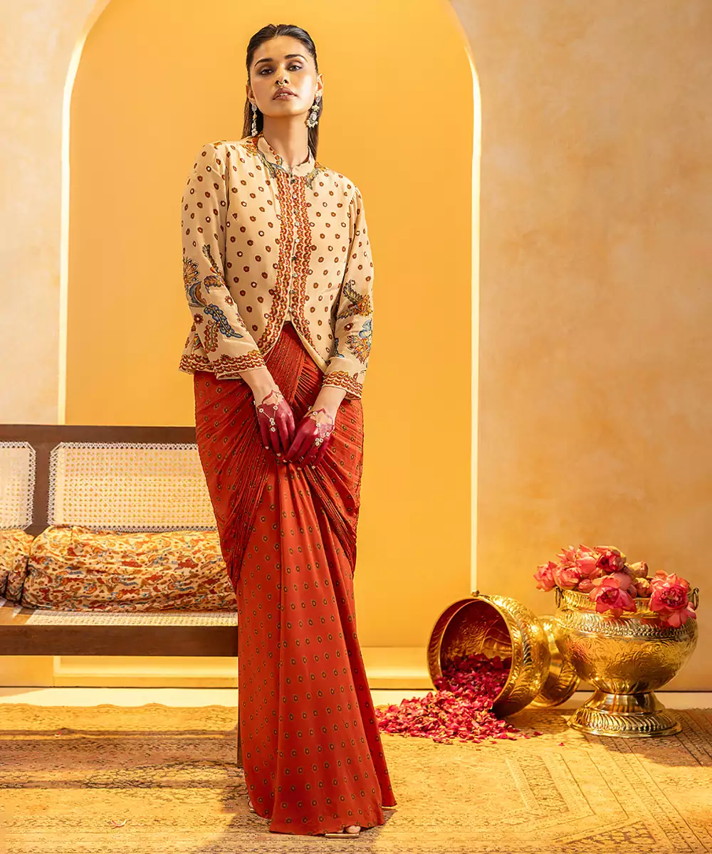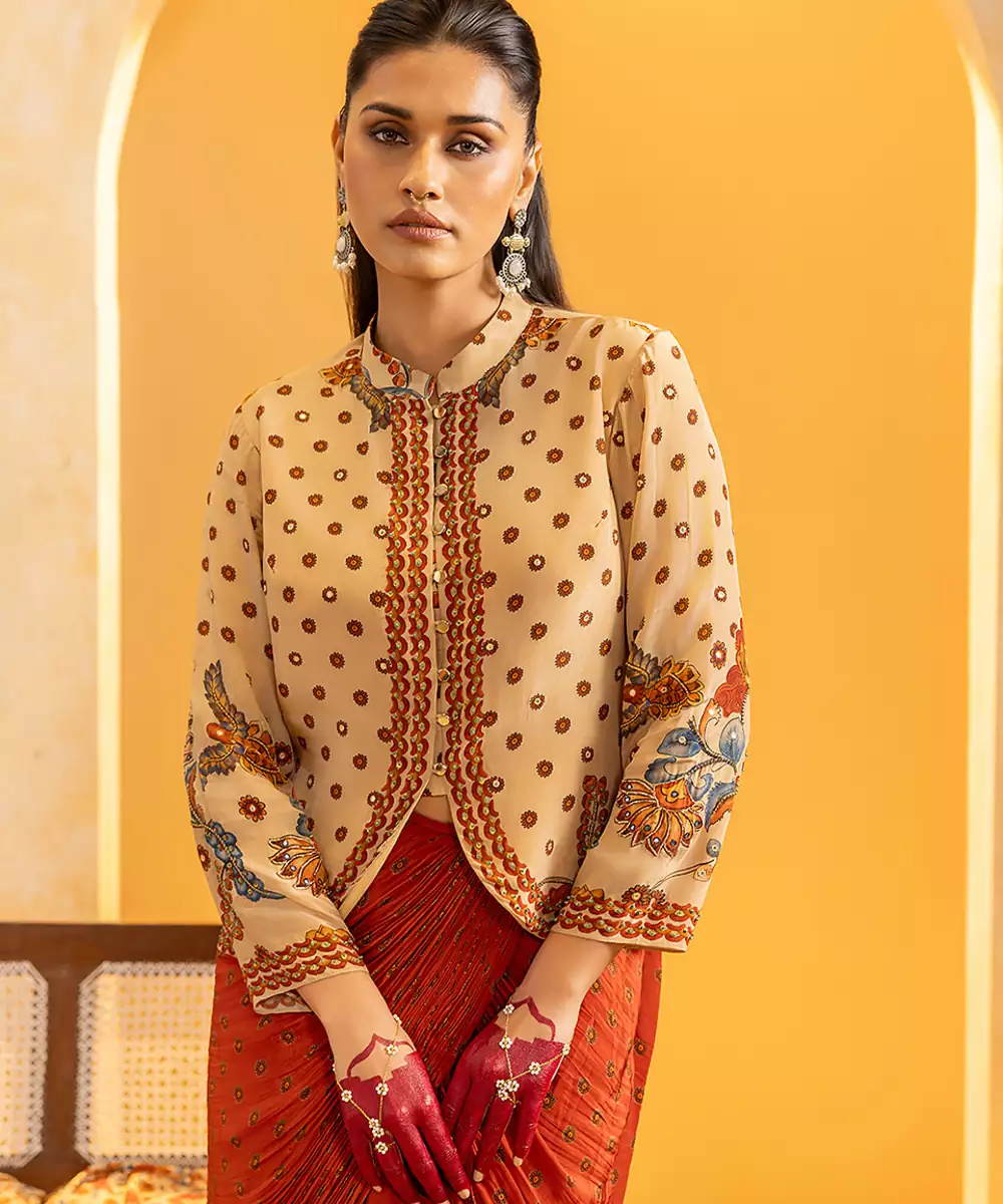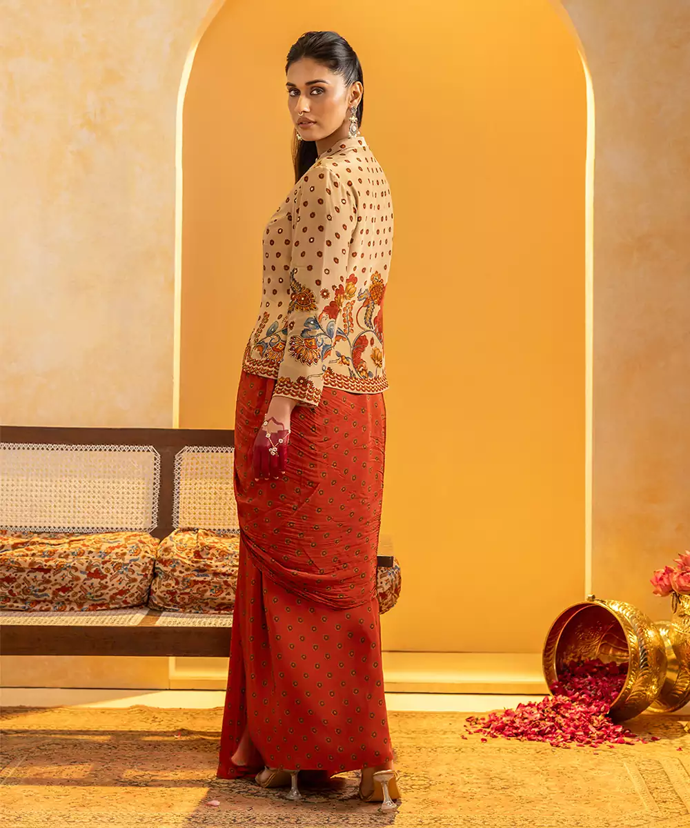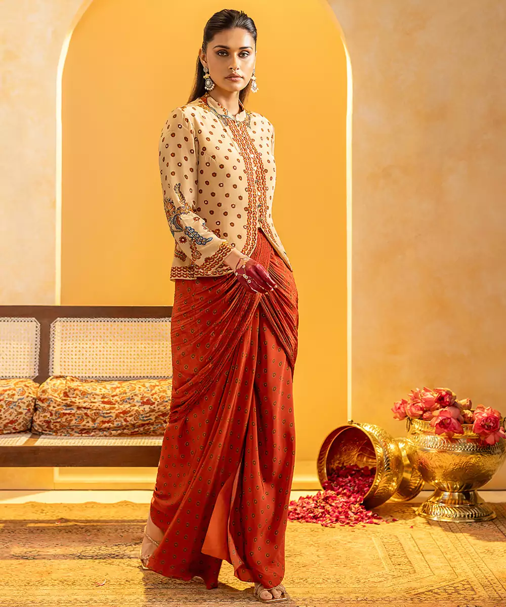Beige Rangtara Jacket With Long Sleeves, Paired With Printed Drape Skirt Set In Crepe. Colour: Beige Fabric: Crepe Components: 1 Skirt / 1 Jacket