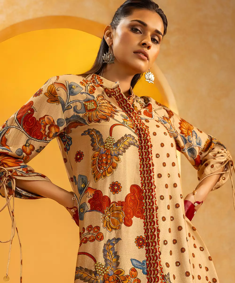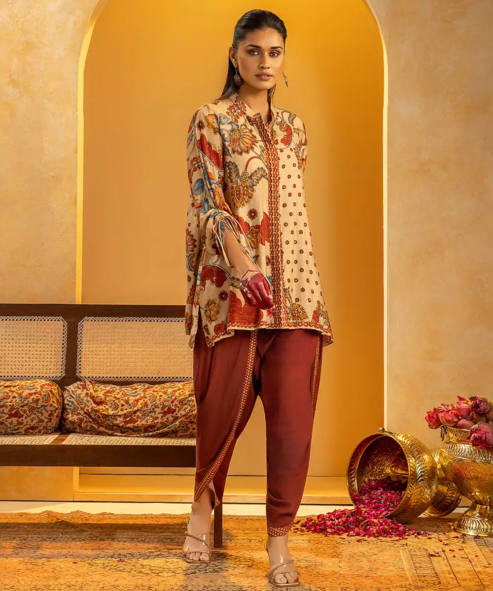 Beige Rangtara Embellished Kurta With Gathered Sleeve, Paired With Dhoti Style Pants In Cotton Silk. Colour: Beige Fabric: Silk Components: 1 Kurta / 1 Pant