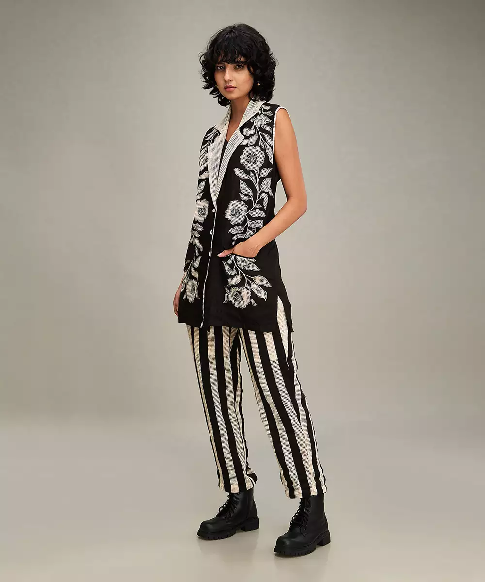 Featuring A Off White Zinnia Applique Sleeveless Blazer Top In Chanderi, Paired With Striped Patchworked Pants In Handloom Net.