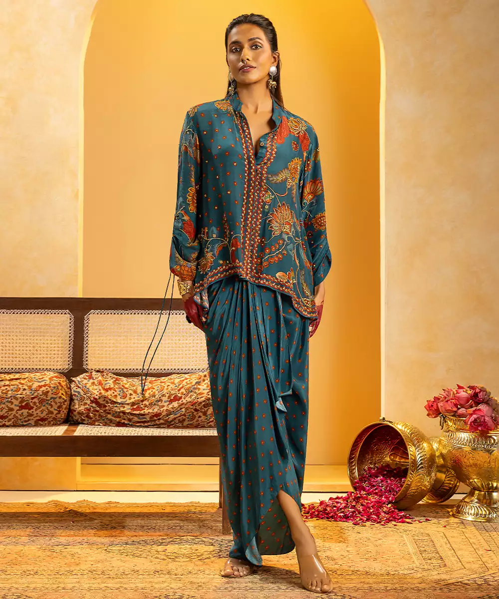Blue Rangtara Embellished Shirt With Gathered Sleeves, Paired With A Printed Crepe Skirt. Colour: Blue Fabric: Crepe Components: 1 Top / 1 Skirt