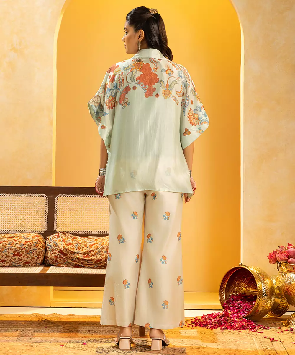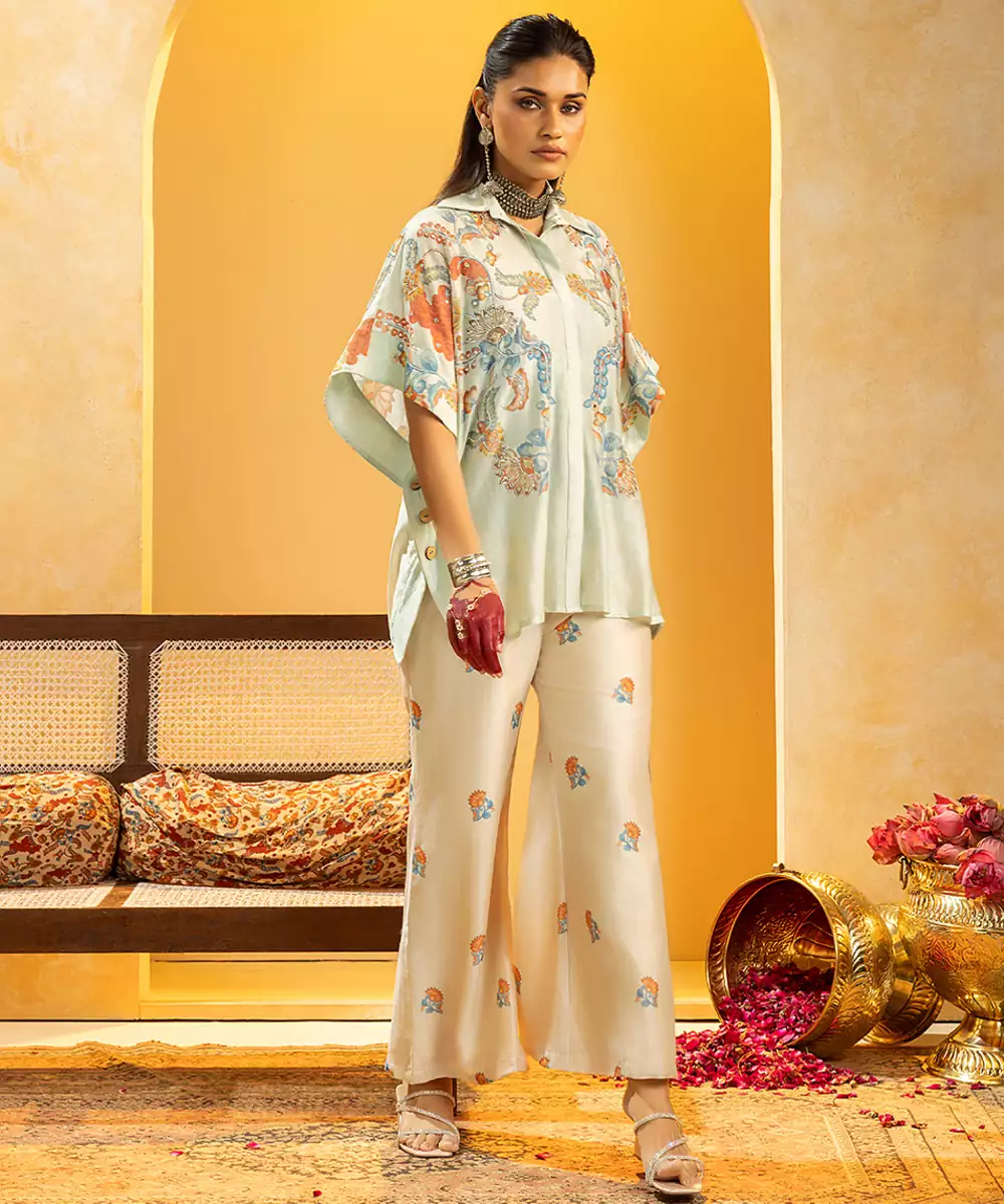 Blue Rangtara Embellished Shirt, Paired With Printed Straight Pants In Chanderi. Colour: Blue Fabric: Chanderi Components: 1 Top / 1 Pant