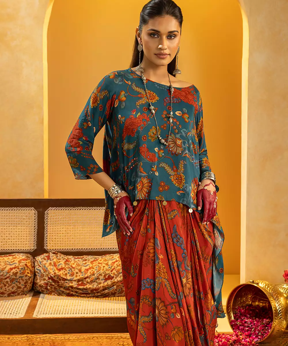 Blue Rangtara Embellished Asymmetric Top With, Paired With A Printed Crepe Skirt. Colour: Blue Fabric: Crepe Components: 1 Top / 1 Skirt