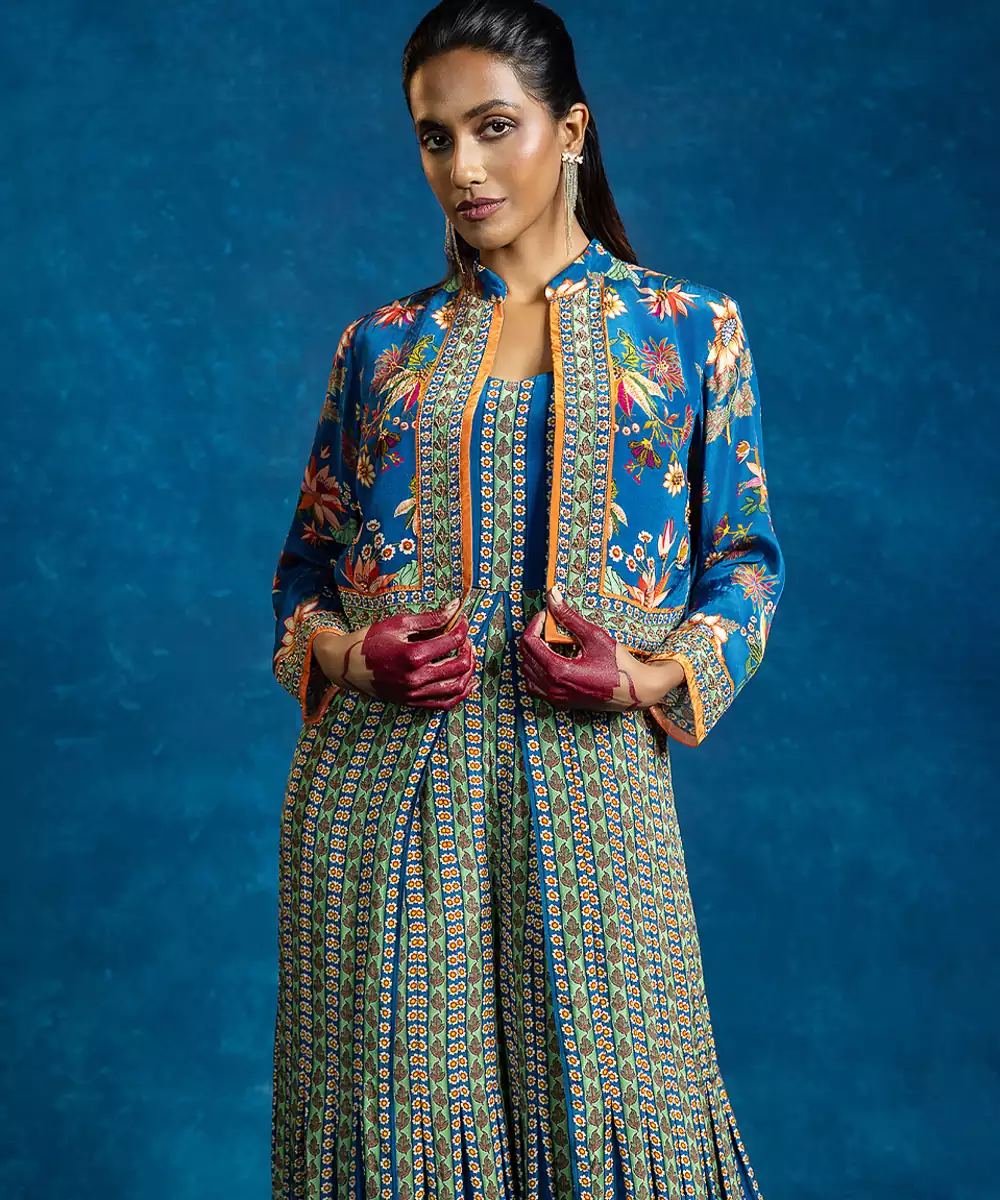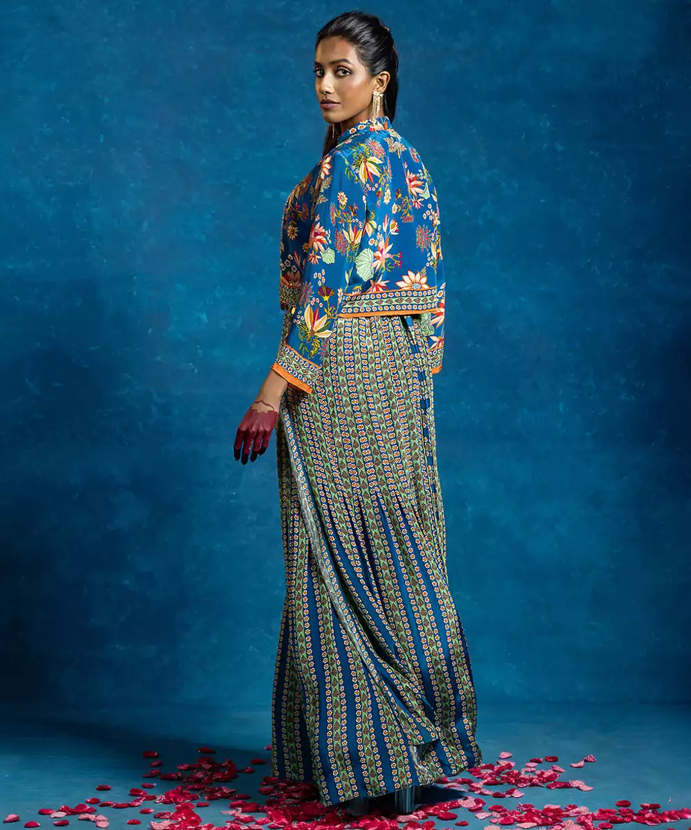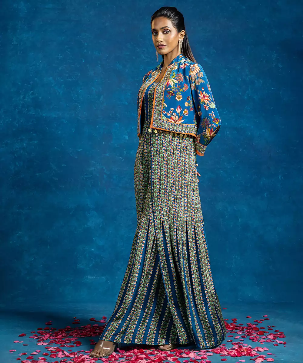 Blue Aarani Printed Flaired Jumpsuith With Pintuck Detail, Paired With Embroidered Short Jacket In Crepe.
