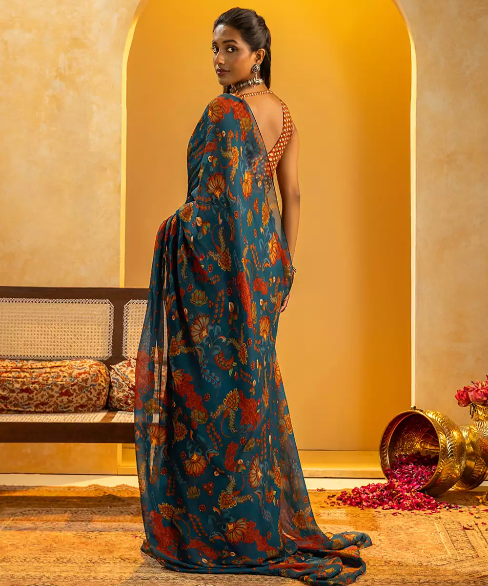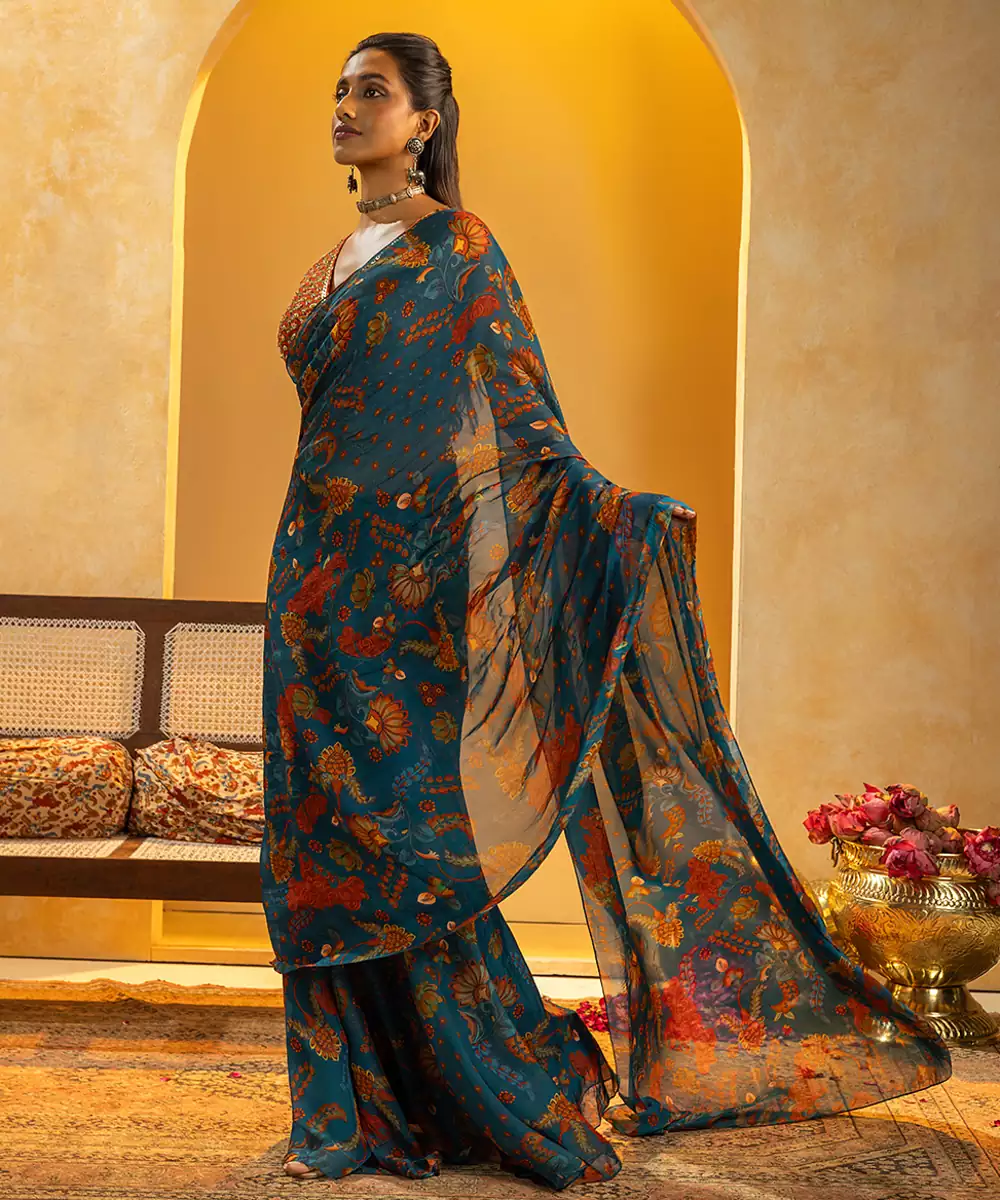 Blue Rangtara Embellished Pre Stitched Saree In Organza, Paired With Red V Neck Blouse In Silk.