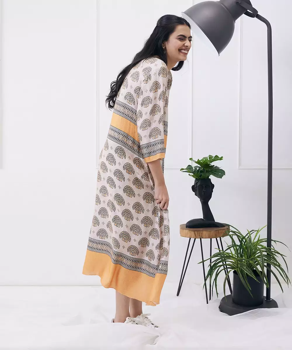Beige Ela Printed Front Slit Boxy Dress In Jacquard. Colour :Beige Fabric : Satin Components : 1 (Dress) Work : Embroidered