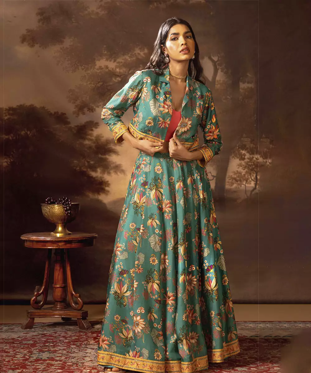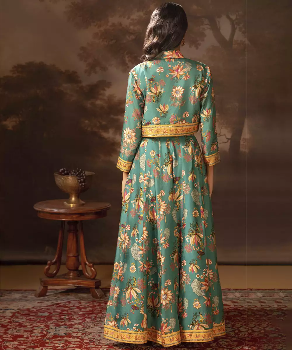 Green Aarani Printed Lehenga Set With An Embroidered Short Jacket In Silk. Fit: Relaxed Wash Care: Dry Clean Only