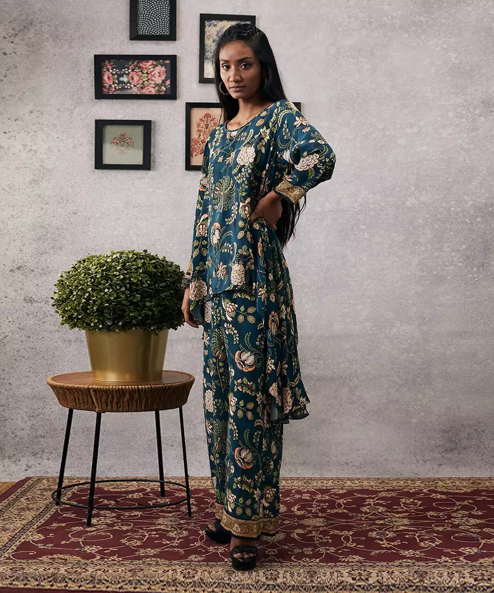 Green Mehr Embroidered Asymmetrical Top With Straight Pants In Crepe. Colour : Green Fabric : Crepe Components : 2 (Top,Pant) Work : Embroidered